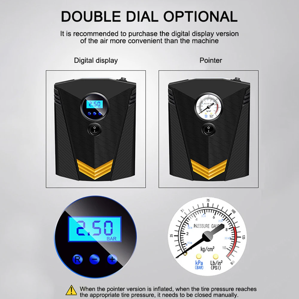 -2019 новый модернизированный цифровой шинный инфлятор, 4 важных обновления. Более мощный, более прочный, быстрый и меньший уровень шума. -Это делает надувание низких и плоских шин в аварийной ситуации проще и удобнее. Манометр дисплей блока воздушного компрессора: PSI, бар, кПа, кгс/см2. -До 3 метров 12 В автомобильного шнура питания, может эффективно обеспечить работу радиуса продукта, нажмите кнопку, чтобы немедленно зарядить без затяжки. -Встроенный разъем для хранения кабеля и разъем для хранения шлангов, не нужно беспокоиться, что шнур слишком длинный, чтобы положить, более удобный в использовании. -Со встроенным светодиодный светильник, вам не составит труда увидеть, что вы делаете со своей шиной, даже когда вы работаете в темном гараже, припаркованном под сломанный уличный светильник, или сломается рядом с неосвещенной сельской дорогой. -Отлично подходит для многих типов шин: автомобилей, велосипедов, мотоциклов, RV, SUV, ATV, резиновых кораблей, а также спортивного оборудования и надувных изделий. Три дополнительных насадки и адаптеры, которые входят в комплект, делают компрессор универсальным и более широко используемым.