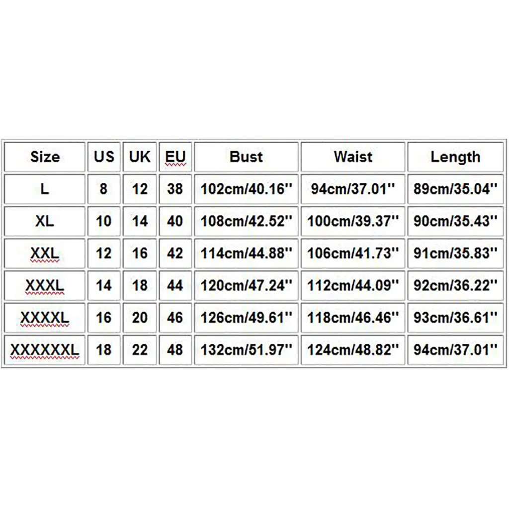 Что вы получаете: 1 женское платьеРазмеры Свяжитесь с нами Великобритания ЕС Обхват груди Обхват талии Длина L 8 12 38 102 см/40,16'' 94 см/37,01'' 89 см/35,04'' XL 10 14 40 108 см/42,52'' 100 см/39,37'' 90 см/35,43'' XXL 12 16 42 114 см/44,88'' 106 см/41,73'' 91 см/35,83'' XХХL 14 18 44 120 см/47,24'' 112 см/44,09'' 92 см/36,22'' XXXXL 16 20 46 126 см/49,61'' 118 см/46,46'' 93 см/36,61'' XXXXXXL 18 22 48 132 см/51,97'' 124 см/48,82'' 94 см/37,01''