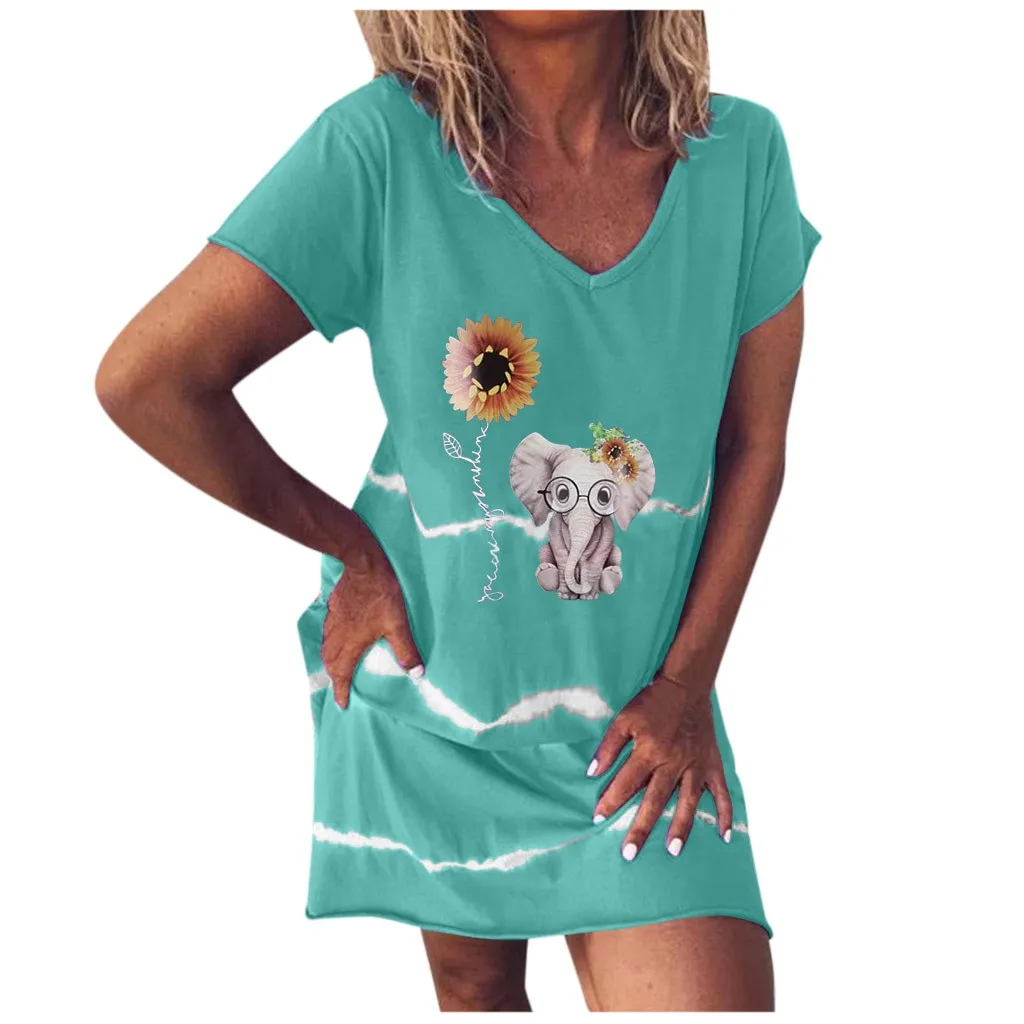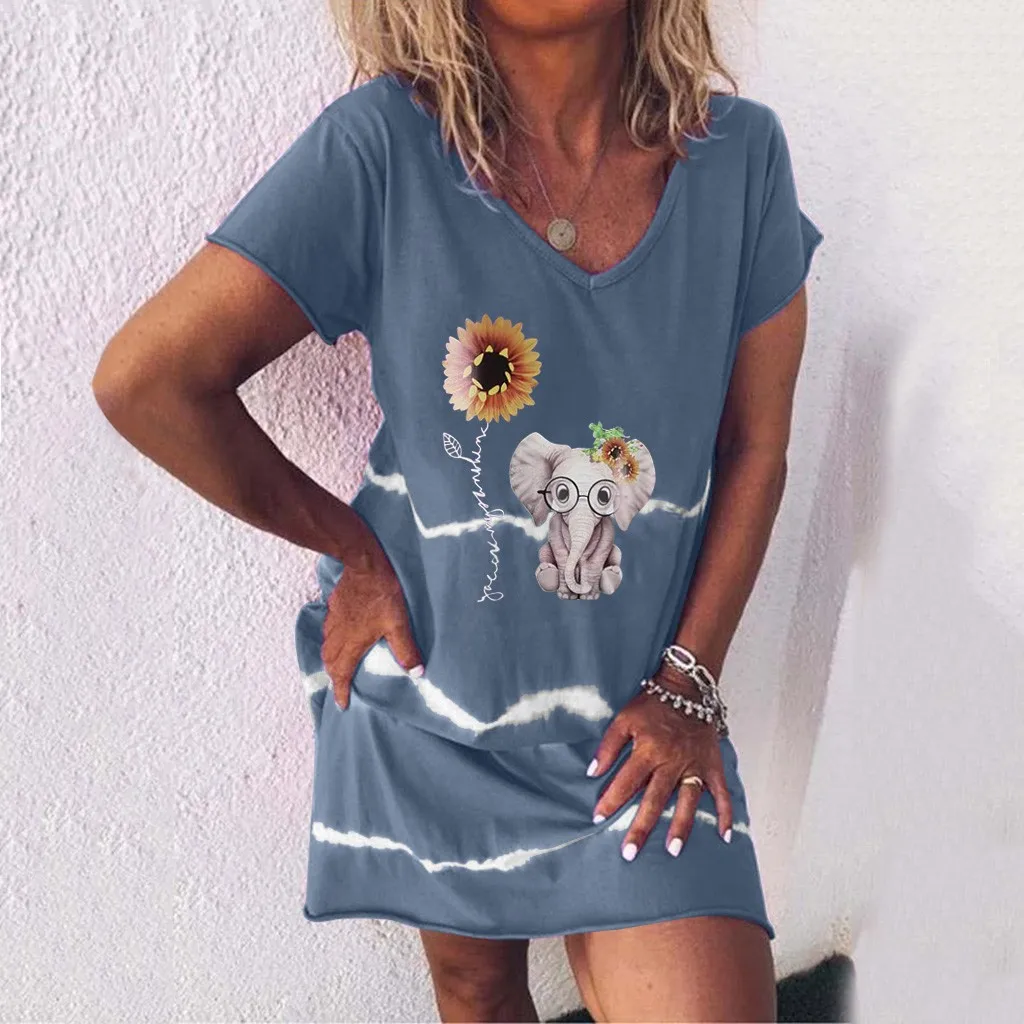 Женская повседневная одежда с принтом слона с v-образным вырезом и коротким рукавом Платье