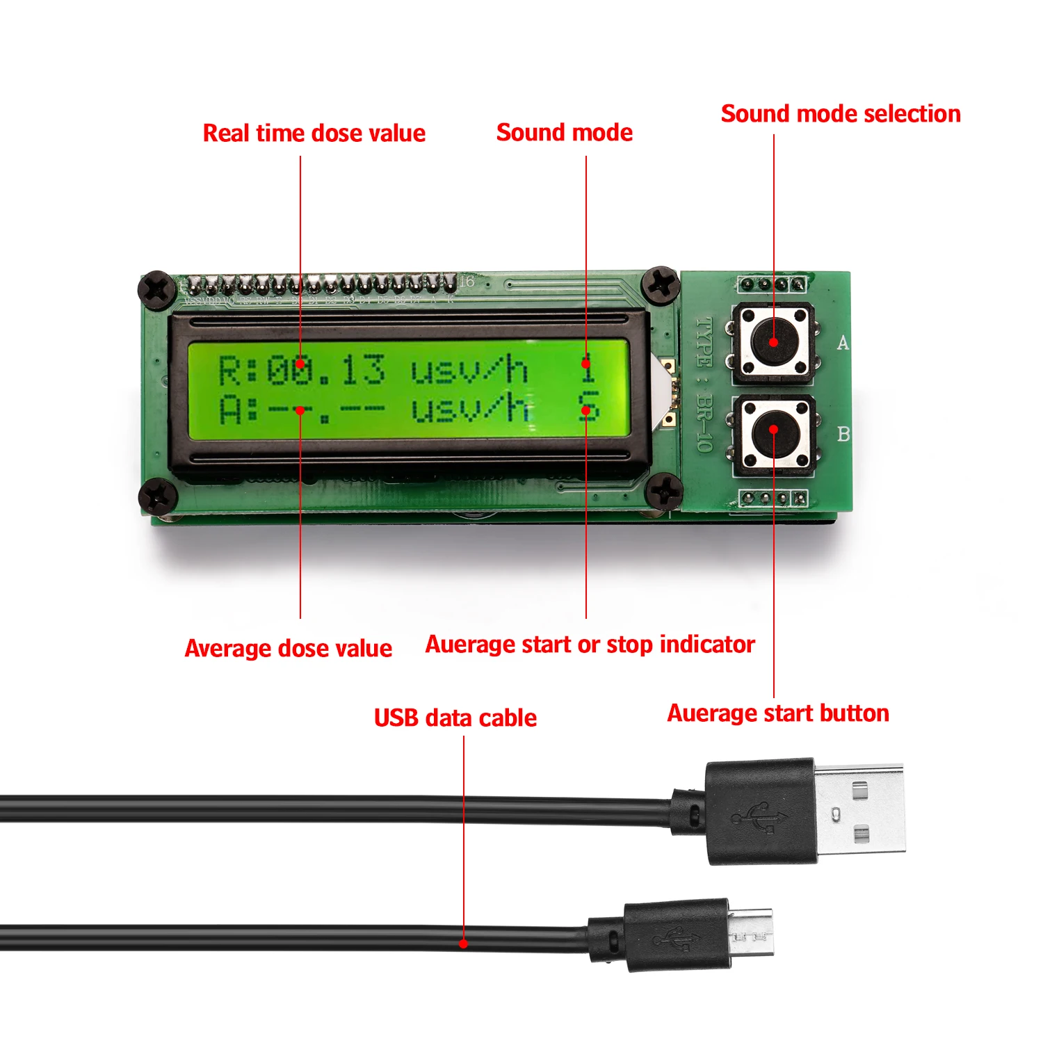 Питание с помощью интерфейса USB, вы можете использовать любое зарядное устройство с выходом USB для источника питания. Клавиша A используется для выбора звукового режима, 1-гранулированный звуковой режим (клик), 2-это звуковой сигнал режим (сигнал тревоги в тех случаях, когда в режиме реального времени и соотношение цена/качество выше, чем 0,5, бип-бип), 3 находится в бесшумном режиме. Клавиша B используется для запуска средней функции тестирования. Когда начинается Средний расчет, вторая строка ЖК-экрана отображает «--.--» и средний значок отображает «s». Примерно через 5 минут Средний расчет заканчивается, а вторая строка отображает средний результат «xx.xx», а средний значок отображает «o».