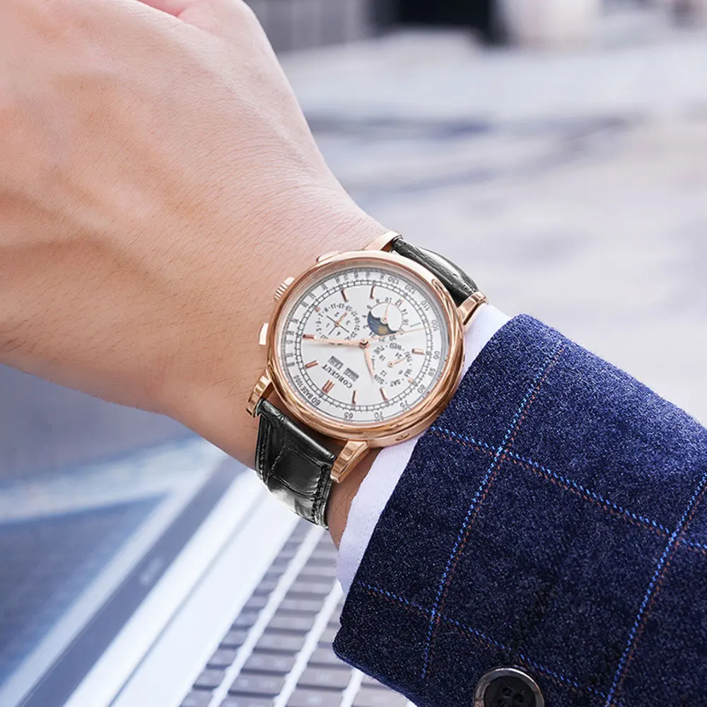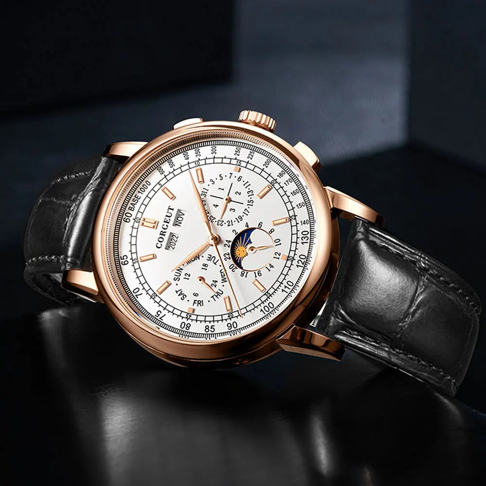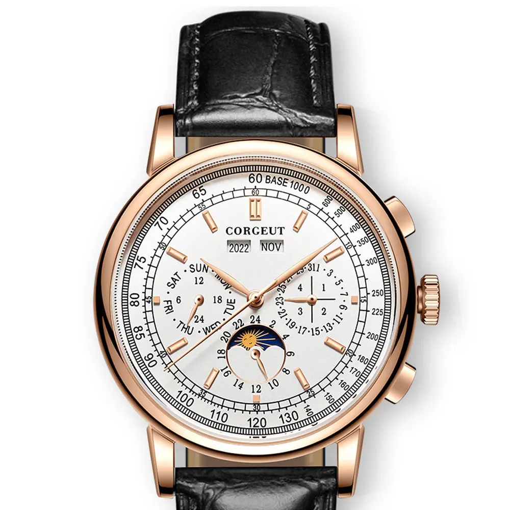 Описание: > Есть 4 модели 1. Ремешок с белым циферблатом 1-коричневый кожаный ремешок 2. Белый ремешок с циферблатом 2 --- черный кожаный ремешок 3. Черный циферблат Ловушка 1 --- коричневый кожаный ремешок 4. Черный ремешок с циферблатом 2 --- черный кожаный ремешок > Движение: Автоматическое (самонамоточное) движение; > Циферблат: белый/черный циферблат; > Материал корпуса: твердый корпус из нержавеющей стали 316L. > Чехол диаметр: 42 мм без короны > Ремешок: ремешок шириной 21 мм > Чехол Толщина: 13,5 мм > Тип застежки: пряжка на булавке. Стекло: специальное устойчивое к царапинам минеральное стекло. > Функции: неделя, месяц, дата, 24 часа Когда вы нажимаете кнопку в 2 часа, вы можете настроить месяц Когда вы нажимаете кнопку в 4 часа, вы можете настроить дату Когда вы нажимаете кнопку в 8 часов, вы можете настроить неделю > Пожалуйста, обратите внимание, не Отрегулируйте маленький циферблат, когда время от 10 часов до 3 часов, или это может повредить движение