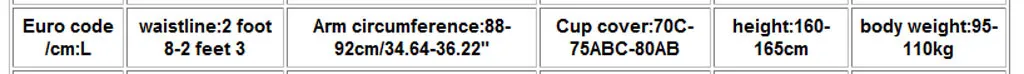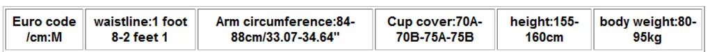 Европейский код/см Линия талии Окружность руки Чехол для чашки Высота Масса тела М 1 фут 8-2 фут 1 84-88 см/33,07-34,64" 70A-70B-75A-75B 155-160 см 80-95 кг L 2 фута 8-2 фута 3 88-92 см/34,64-36,22" 70C-75ABC-80AB 160-165 см 95-110 кг XL 2 ступни 2-2 ступни 5 92-96 см/36,22-37,79" 75D-80ABC-85AB 165-175 см 110-125 кг