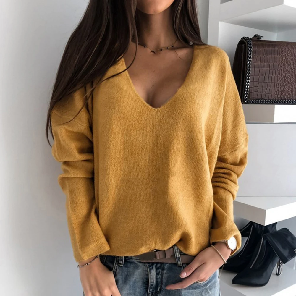 Women Autumn Loose Solid Color V Neck Long Sleeve Plush Pullover Sweater