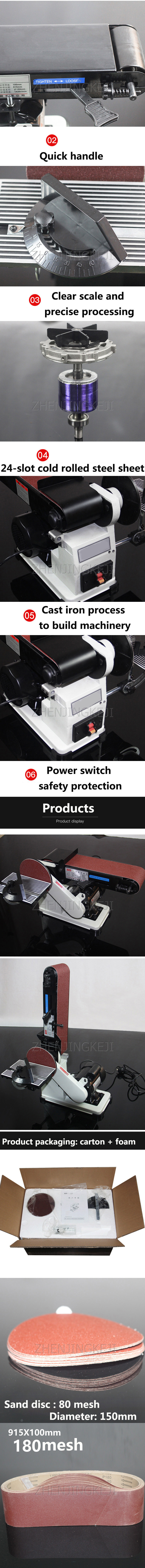 Модель: FS-450 Напряжение: 220V Частота: 50 Гц Мощность: 450W Вес: 18 кг Размер: 520*315*300 мм Диаметр песочного диска: 150 мм Характеристики ремня: 915 мм; 6 дюймов Диапазон наклона песочного стола: 0-60 градусов Скорость песочного диска: 1420р/мин Диапазон наклона рабочего ремня: 0-90 градусов Скорость конвейерной ленты: 4,7 м/с Размер стола: 190*125 мм