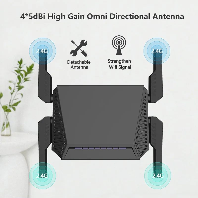 Использование 2x2 MIMO (несколько входов, несколько выходов) архитектура, скорость передачи до 300 м, внешние 4 5dBi с высоким коэффициентом усиления всенаправленные антенны.