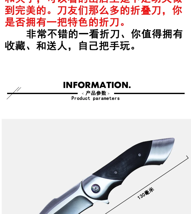 Новый складной нож SHOOZIZ с рукояткой G10 8CR13MOV, тактические карманные ножи с подшипником, уличный резак для самообороны, охоты, инструменты для повседневного использования Бренд: SHOOZIZ Модель: FJ112 Общая длина: 220 мм Длина клинка: 90 мм Длина ручки: 127 мм Толщина клинка: 4 мм Ширина клинка: 34 мм Материал клинка: 8CR13MOV Материал ручки: G10 Обработка лезвия: сатиновое покрытие Обработка ручки: ЧПУ Твердость: 58-60 HRC Система: система стальных подшипников Вес нетто: 201 г (погрешность 2 г) Другое: картонная подарочная упаковка Пожалуйста, поймите: 1. Различные среды съемки будут иметь разные оттенки в разных средах съемки. Пожалуйста, поймите. Вы можете купить его снова. 2. Поскольку изображения не могут быть полностью отображены, все они являются объектами! Если вы хотите узнать больше о продукции, пожалуйста, свяжитесь с нами! Спасибо!