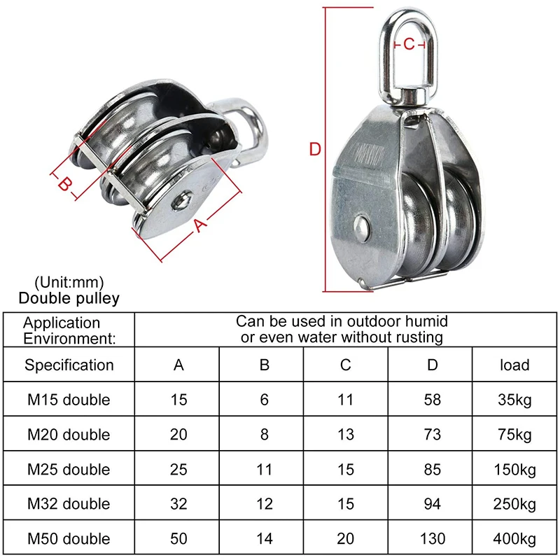 Тип: M25 блок с двойным шкивом, подходит для веревки в пределах 8 мм.