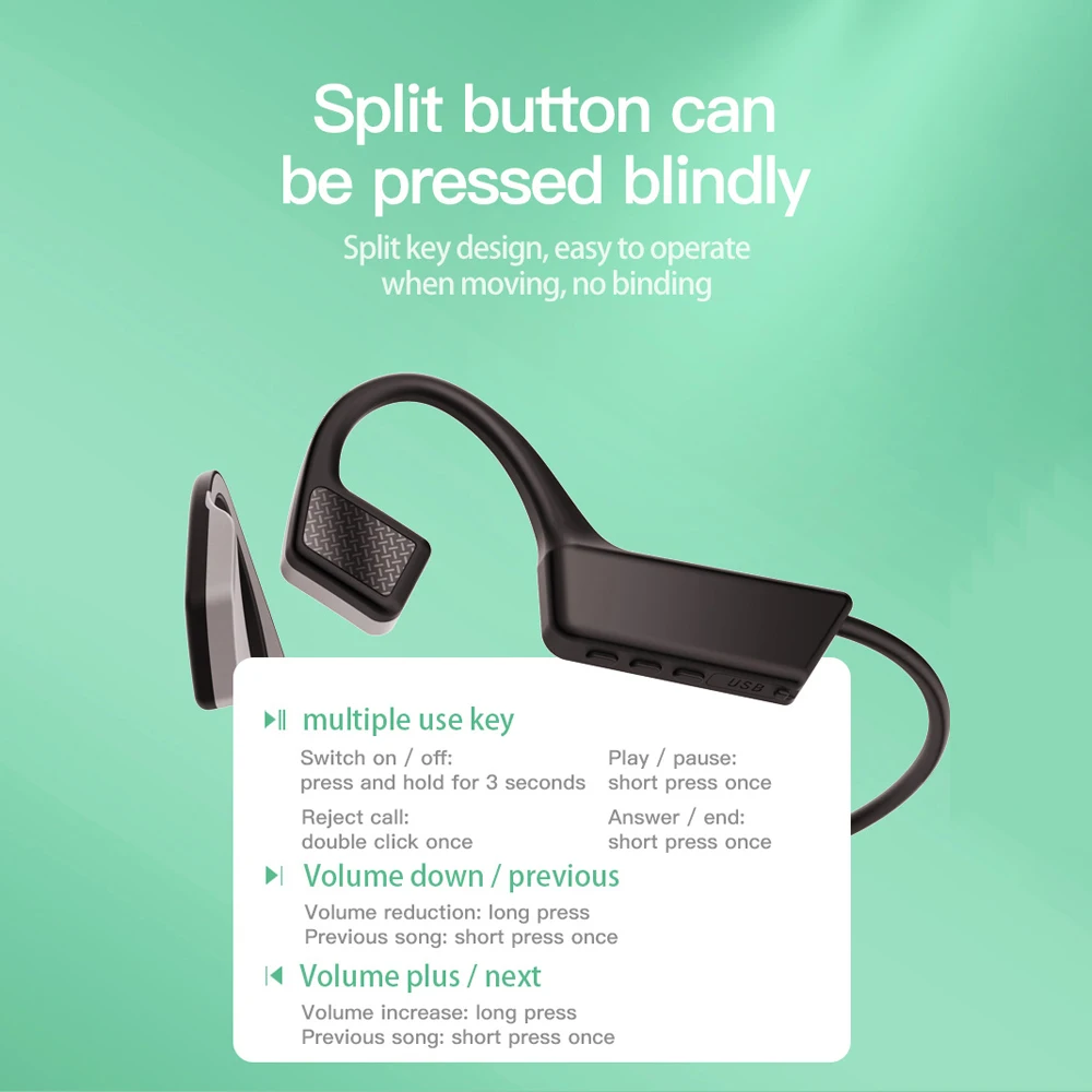 Гарнитура BT с костной проводимостью, с высококлассным чипом BT, имеет четкое качество звука и не создает шума. Это носить из ушей, не повреждая при этом уши.