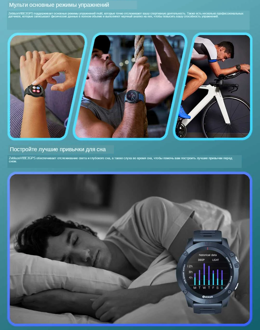 Zeblaze VIBE 3GPS поддерживает основные режимы упражнений mulit, которые точно отслеживают ваши спортивные мероприятия. Есть также несколько профессиональных датчиков, которые записывают физические данные в полном объеме, и выполняют научный анализ на них, чтобы повысить вашу способность упражнений.