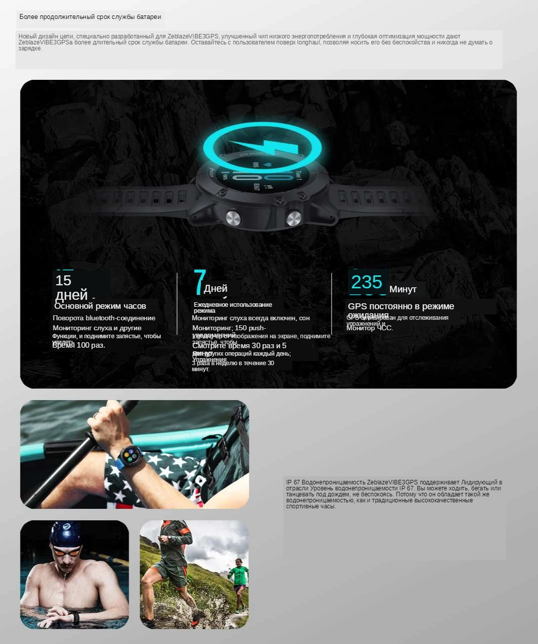 Zeblaze VIBE 3GPS поддерживает Лидирующий в отрасли Уровень водонепроницаемости IP67. Вы можете ходить, бегать или надевать в раине, не беспокоясь. Потому что он обладает такой же водонепроницаемостью, как и традиционные высококачественные спортивные часы.
