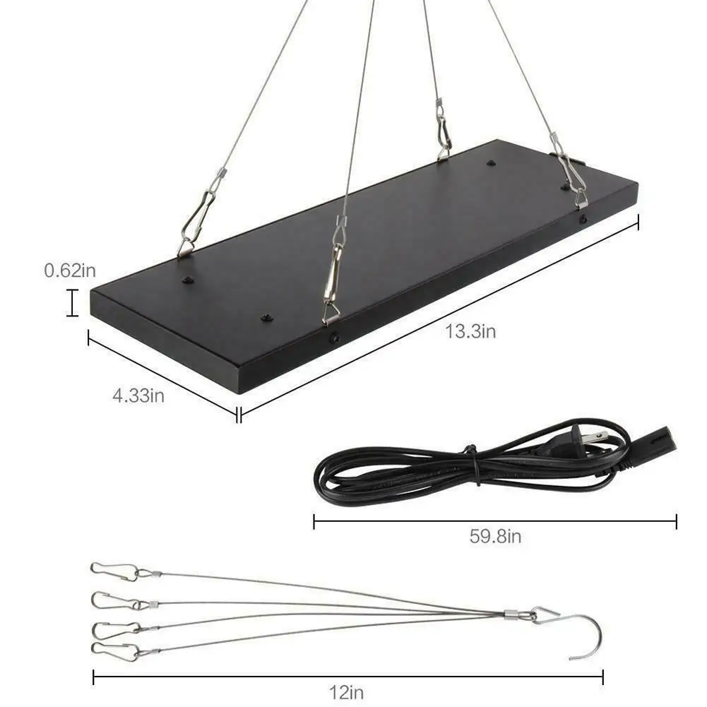 -Размер: 338*110*16 мм -Цвет: черный, серебристый -Размер посылка: 435*385*370 мм -Посылка Вес: 0,9 кг -Материал: алюминий, акриловое волокно -Светодиодный Кол-во: 75 шт. -Светодиодный чип: Красный: Синий: Инфракрасный: УФ = 53:18:2:2 -Люмен: 86300 лм -Входное напряжение: AC85-265V -Рабочая температура: -20 ° ~ 50 ° -Частота: 50-60 Гц -Срок службы: прибл. 50000 часов -Рекомендуем зона покрытия для каждой единицы продукции: 3x2,5 '= защитного стекла 92x76 см (овощи) -Рекомендуем зона покрытия для каждой единицы продукции: 2,5 "x 2' = 76x60 см (Блум) -Максимальный охват на высоте 24 дюйма для одной единицы измерения: 3,5X3 фута = 92x92 см