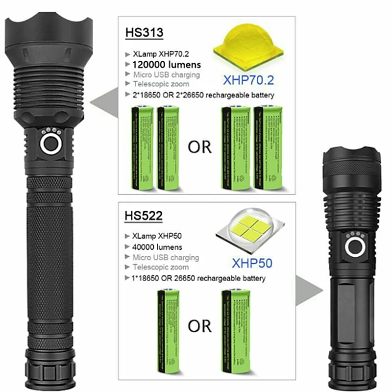 Мощный светодиодный фонарик использует XLamp XHP70.2 светодиодный фонарик для максимальной выходной мощности до 120000 люменов.
