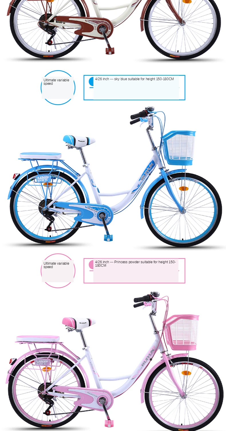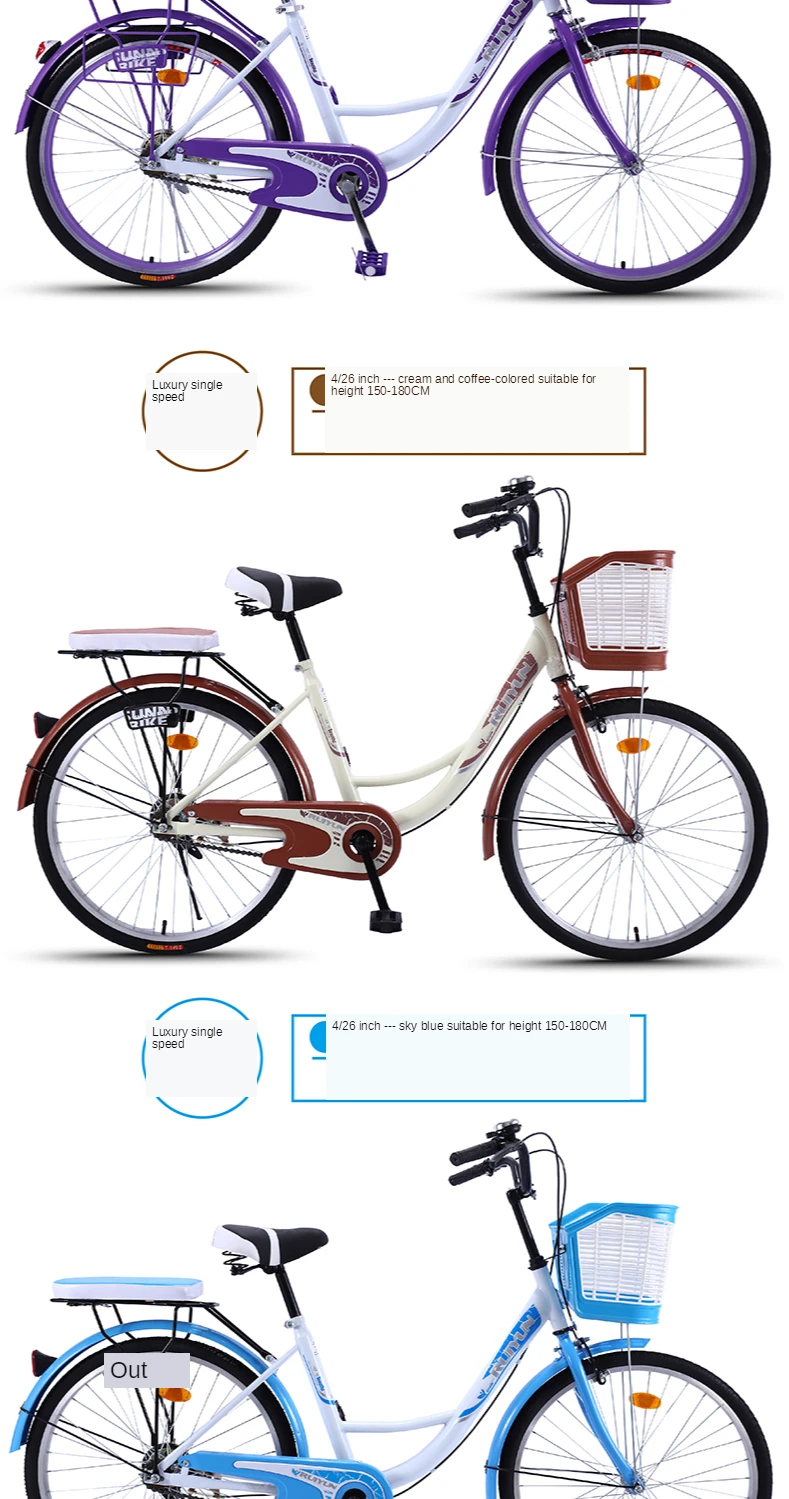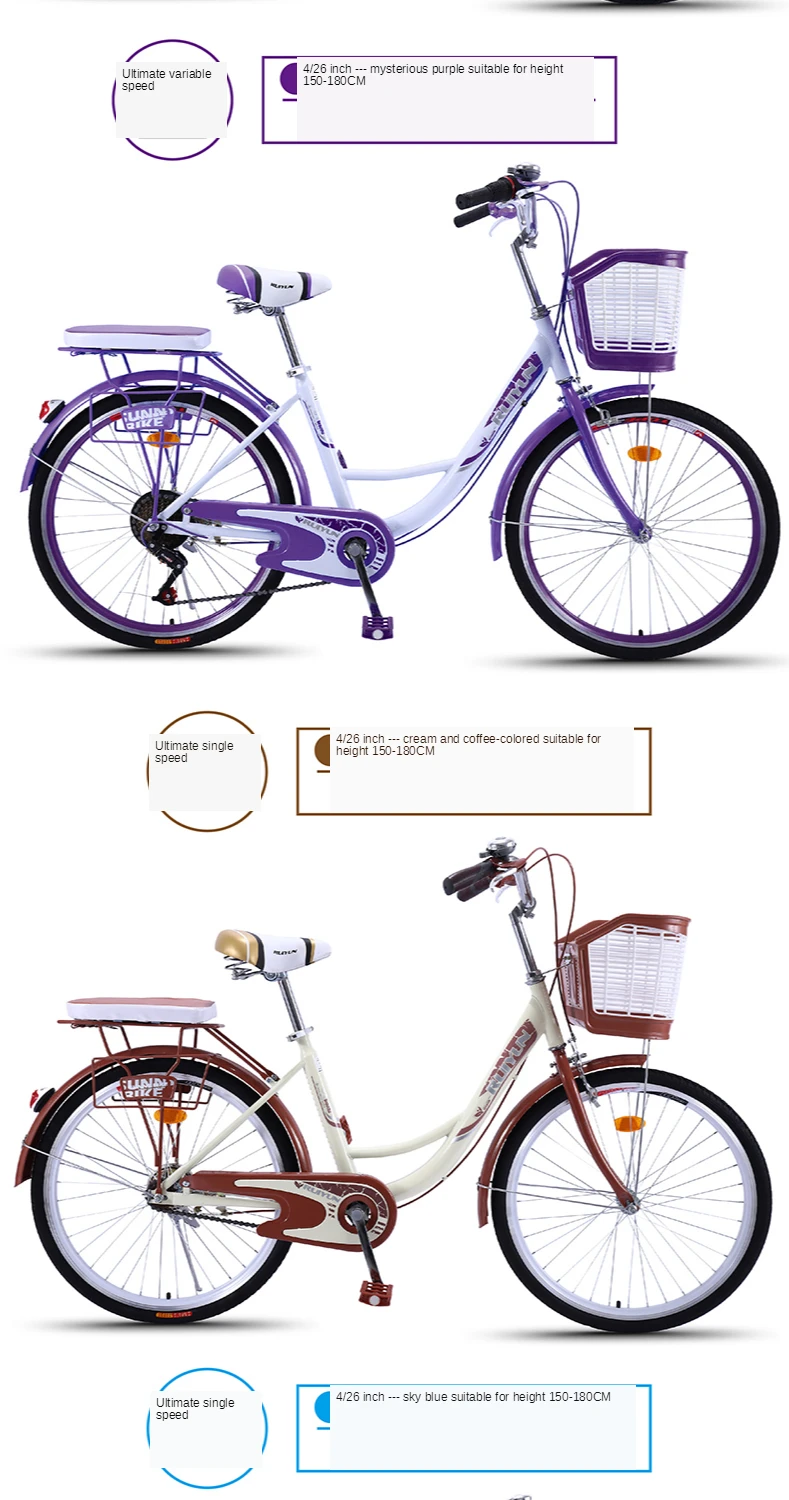 1. Размер колеса: 24 или 26 дюймов 2. 24 дюйма подходит для высоты: от 150 до 170 см 3. 26 дюймов подходит для высоты: от 165 до 180 см 4. Скорость: 6 скоростей 5. Материал рамы: Высокоуглеродистая сталь 6. Тормозная система: передний тормоз V, задний тормоз 7. Вес нетто: 15 кг 8. Вес брутто: 17 кг 9. Размер упаковки: 160*50*120 см 10. Размер транспортного средства: 165*38*80 см