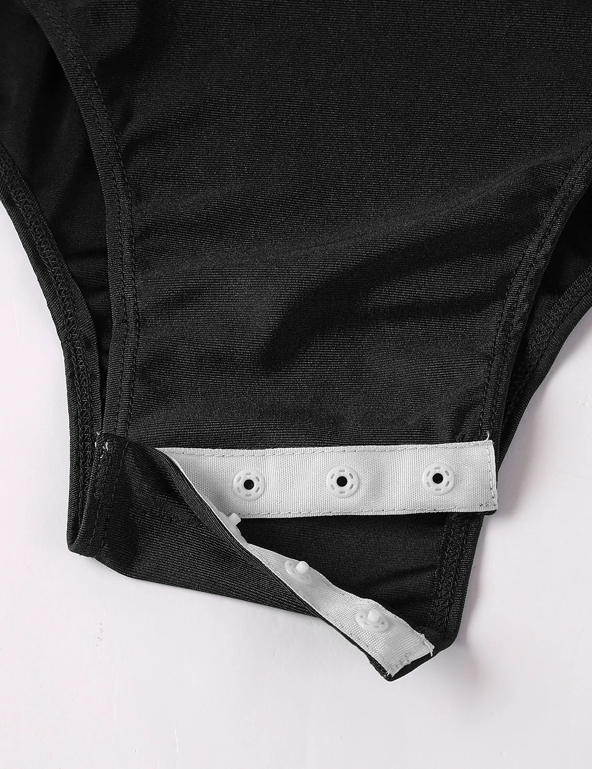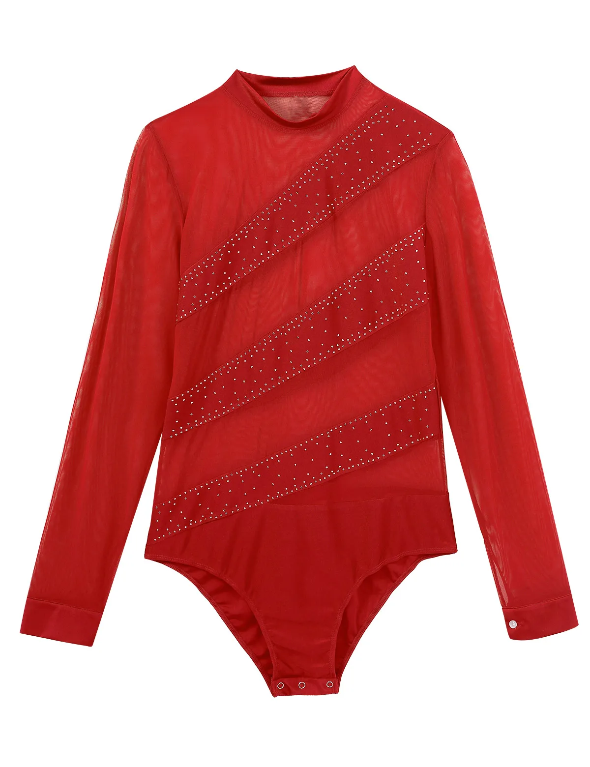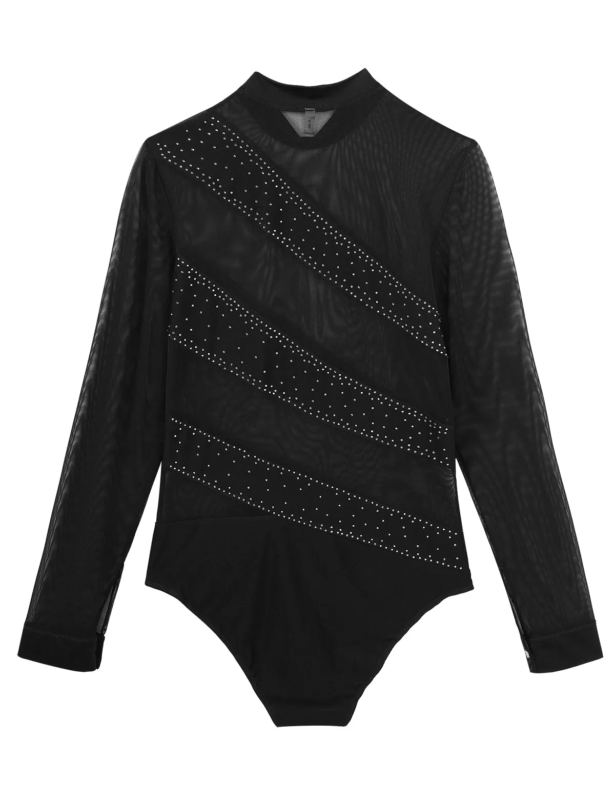 Круглый вырез и длинные рукава, лиф из прозрачной сетки со вставками, блестящие стразы, промежность с 3 кнопками.