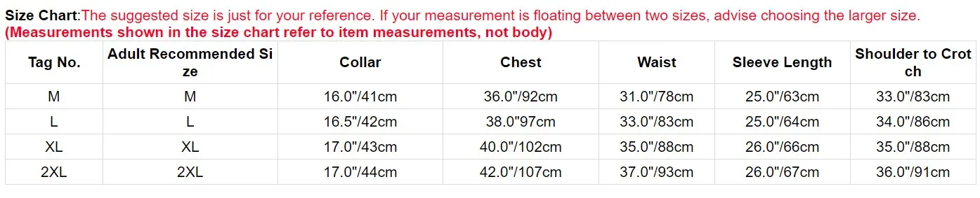 Номер бирки Рекомендуемый размер для взрослых Воротник Грудь Талия Длина рукава От плеча до паха М М 16,0 "/41 см 36,0 "/92 см 31,0 "/78 см 25,0 "/63 см 33,0 "/83 см L L 16,5 "/42 см 38,0 "97 см 33,0 "/83 см 25,0 "/64 см 34,0 "/86 см XL XL 17,0 "/43 см 40,0 "/102 см 35,0 "/88 см 26,0 "/66 см 35,0 "/88 см 2XL 2XL 17,0 "/44 см 42,0 "/107 см 37,0 "/93 см 26,0 "/67 см 36,0 "/91 см Полезные советы: Замеры делаются вручную, поэтому учитывайте небольшие погрешности. Цвет на фото может немного отличаться от реального товара из-за особенностей цветопередачи различных мониторов.