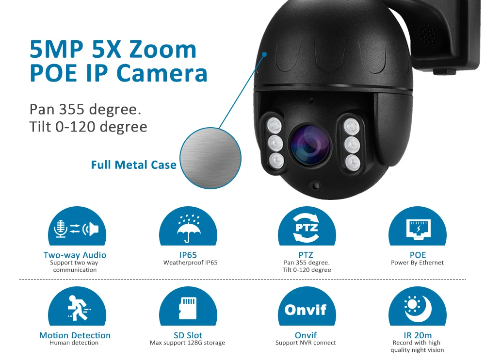 Новая версия ip-камеры PTZ с высоким разрешением 5 МП, намного четче 1080p и 720p. Все камеры обеспечивают невероятно яркие и четкие изображения в реальном цвете, что позволяет очень четко видеть все предметы.