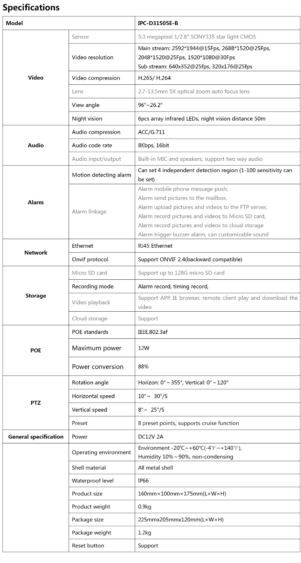 2,7 "металлическая ip-камера панорамирования наклона. Угол обзора диапазон панорамирования: 0 ° ~ 355 °, скорость панорамирования: 120 °/С, Диапазон наклона: 0 ° ~ 90 °, скорость наклона: 45 °/С. Пресеты: 128, функция дистанционного панорамирования/наклона с 5x оптическим зумом, ИК Ночное Видение 35 метров.