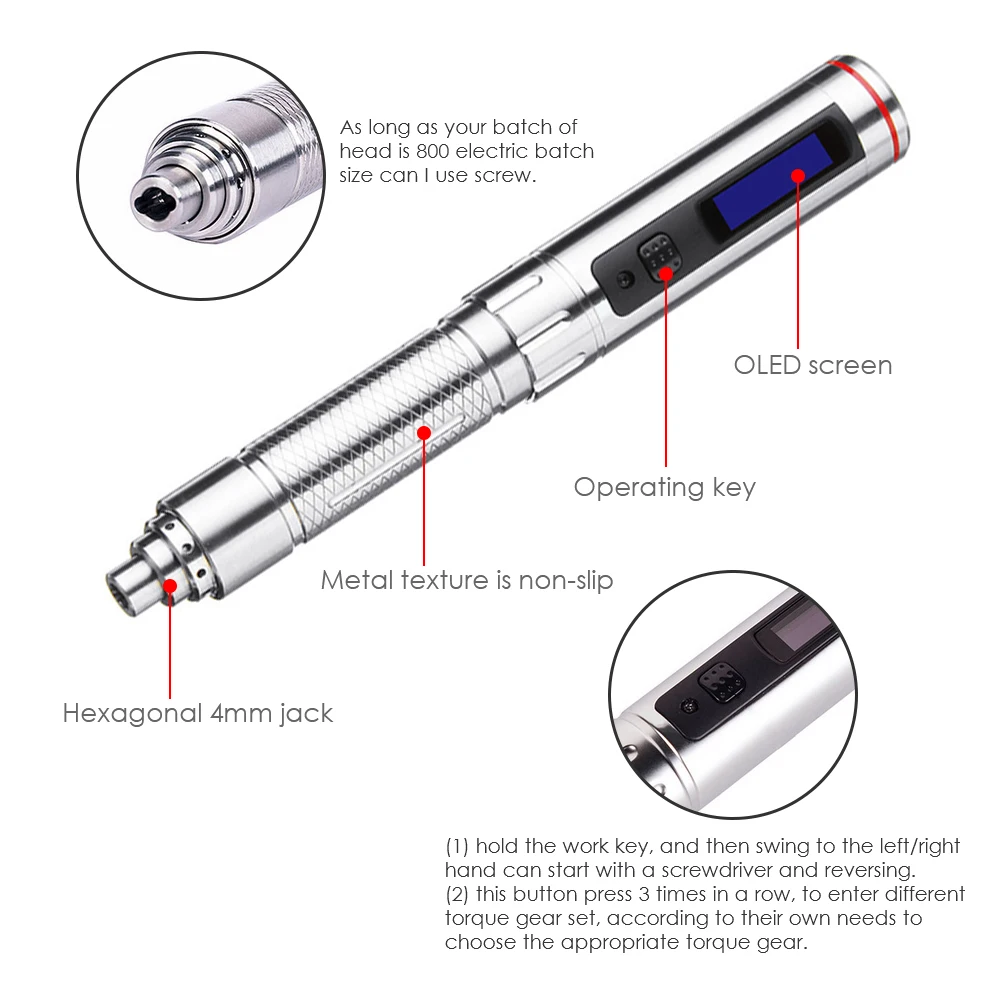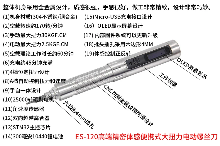 ★Умная Гироскопическая отвертка★ Встроенный SMT32 MCU и 3-осевой Гироскопический датчик с контролем движения, нажмите на датчик в направлении разворота (по часовой стрелке), чтобы винт вниз, на контактном направлении, чтобы винт Поддержка ручного и автоматического двойного режима работы с 4-классным регулируемым крутящим моментом Автоматическое выключение без работы через 15 секунд для экономии энергии 16X96 oled-экран отображает рабочий статус отвертки, выбор крутящего момента и энергию батареи ★Карманный литиевый отвертка★ Отвертка ES120 Plus имеет такой же размер, как и ручка, которая намного меньше, чем традиционная электрическая отвертка 304 Корпус из нержавеющей стали с накатывающими полосками дизайн, противоскользящий и транспортирующий для удержания Встроенный литий-ионный аккумулятор 3,7 в 300 мАч, порт зарядки micro USB и время зарядки 40 минут 380rpm Скорость без нагрузки с 2.5kgf.cm Автоматический крутящий момент и 30kgf.cm ручной крутящий момент В комплекте 16 шт. Набор отверток, портативный чехол из искусственной кожи и usb-кабель для зарядки, удобный в использовании и переноске Посылка включает в себя: 1X ES121 электрическая отвертка 1X PH00 SL2.0 бит 1 ES-A7 Набор бит (7 шт.) 1 ES-B7 Набор бит (7 шт.) 1X Руководство пользователя