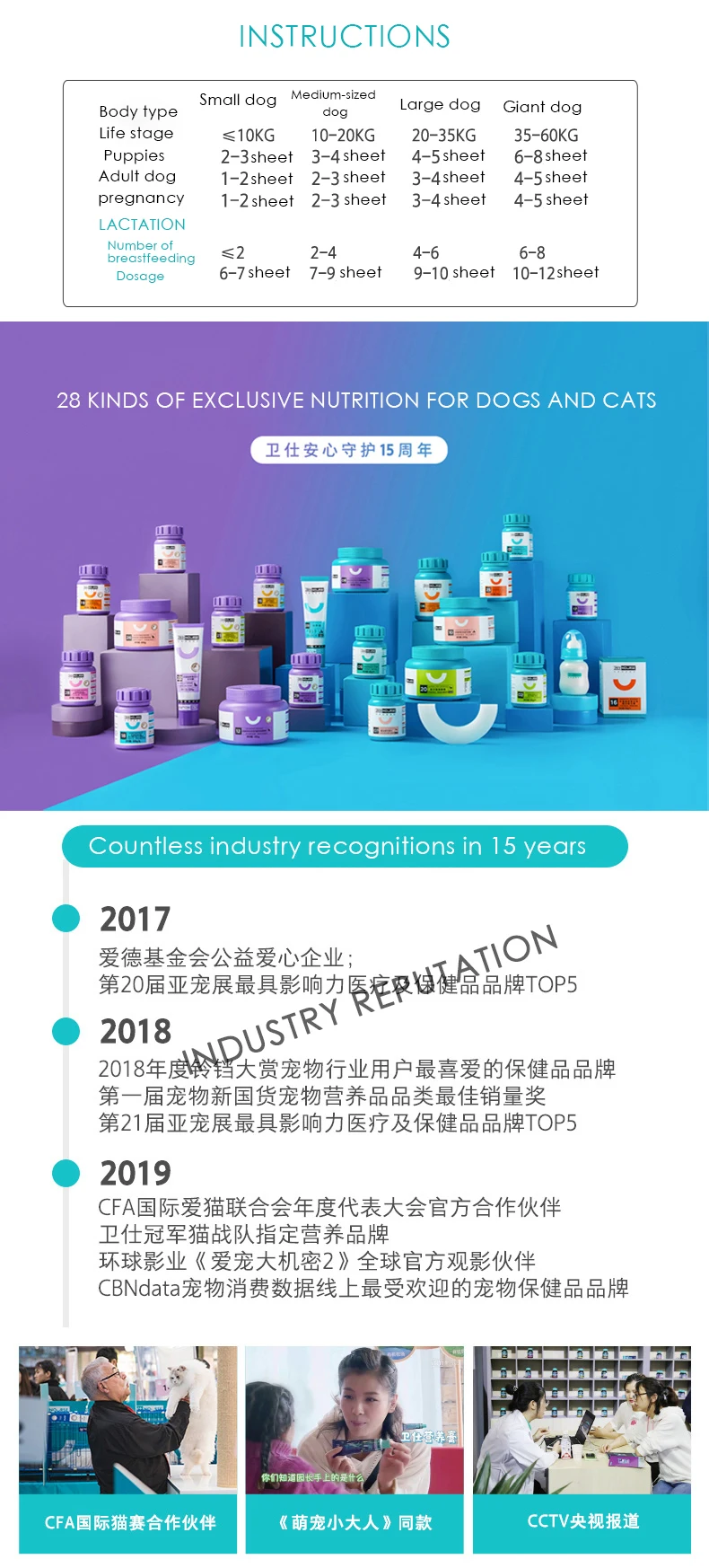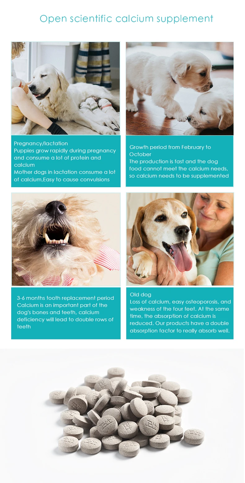 Богатый casein гидролизат CPP Способствует усвоению кальция, мягкому добавке кальция, легко Открытая научная добавка кальция Беременность/кормление грудью Щенки быстро растут во время беременности и потребляют много белка и кальция Собаки-мамы, которые потребляют много кальция в период лактации, могут вызвать судороги Период роста с февраля по октябрь Продукция быстрая, и корм для собак не может удовлетворить потребности кальция, поэтому кальций должен быть дополнен Срок Замены Зуба 3-6 месяцев Кальций является важной частью костей и зубов собаки, недостаток кальция приведет к двойным рядам зубов