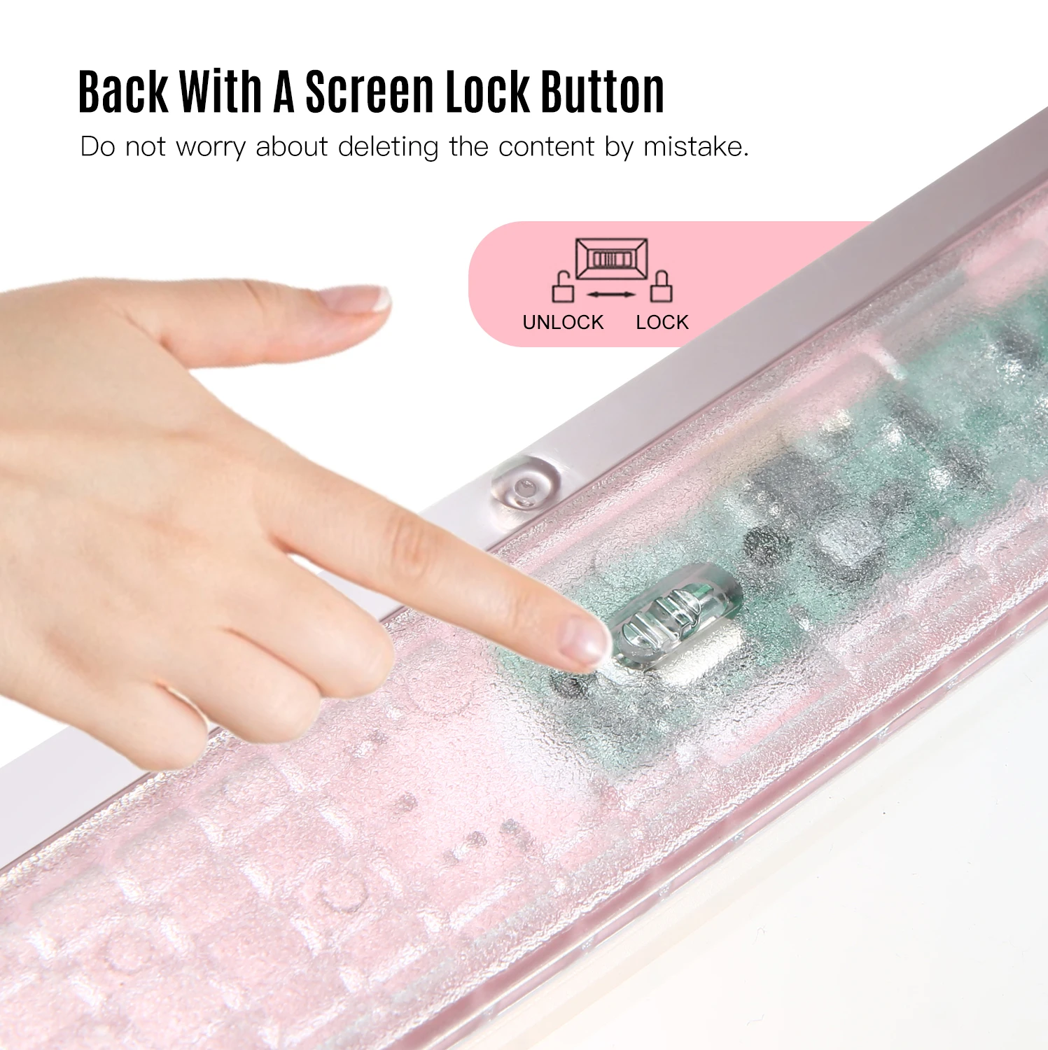 【Стирайте и блокируйте пуговицы 】:С помощью кнопки стирания на планшете для письма нажмите кнопку, чтобы удалить содержимое письма, повторное написание, очень проста в использовании. Назад с дизайном кнопки блокировки экрана, не беспокойтесь об удалении содержимого по ошибке.
