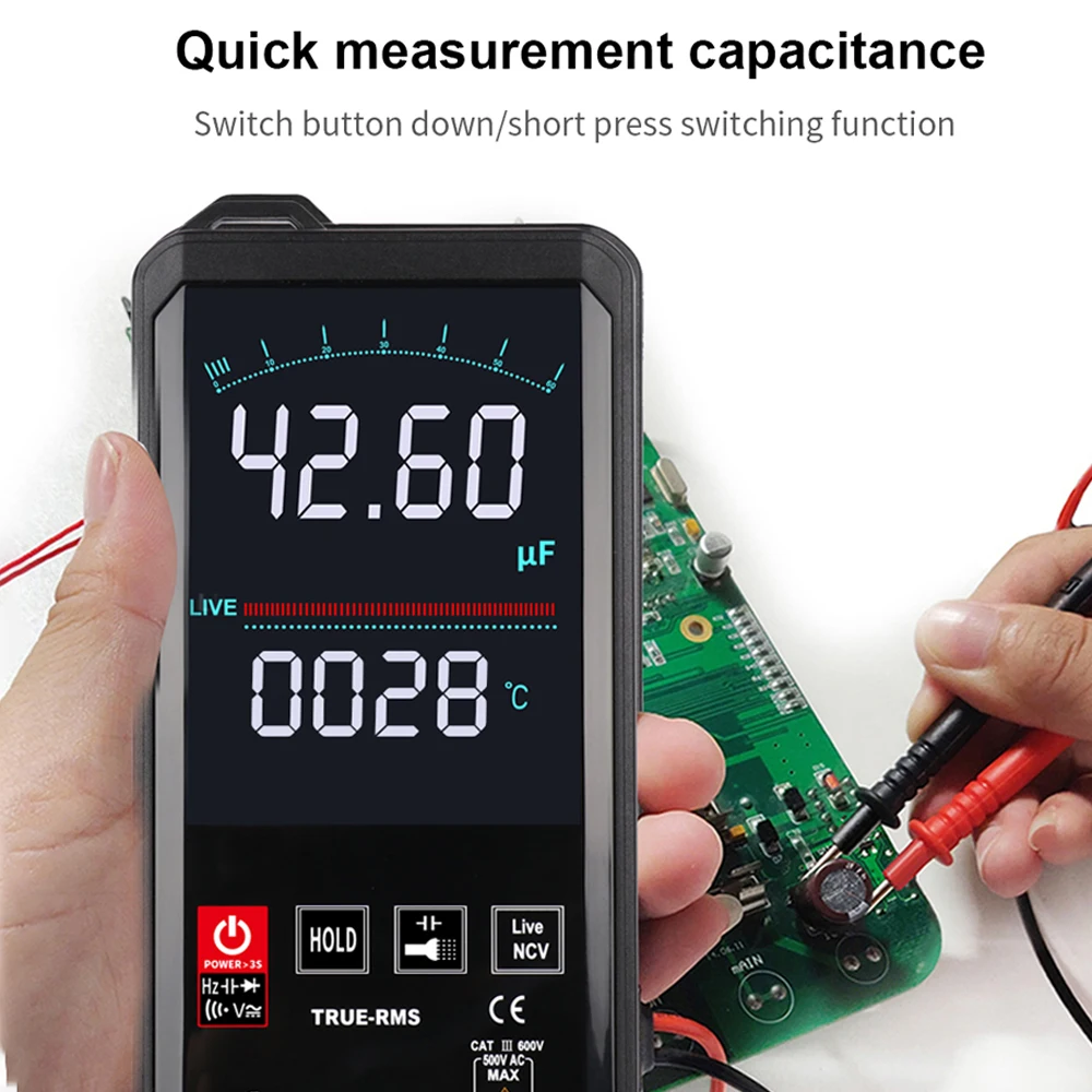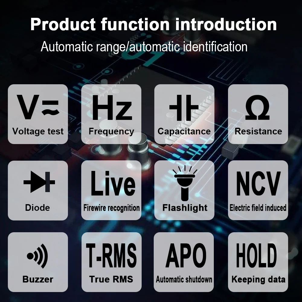 Function: voltage test, frequency test, capacitance test, resistance test, diode test, firewire recognition, flashlight, electric field induced, buzzer alarm, TRUE RMS, automatic shutdown, keeping data.