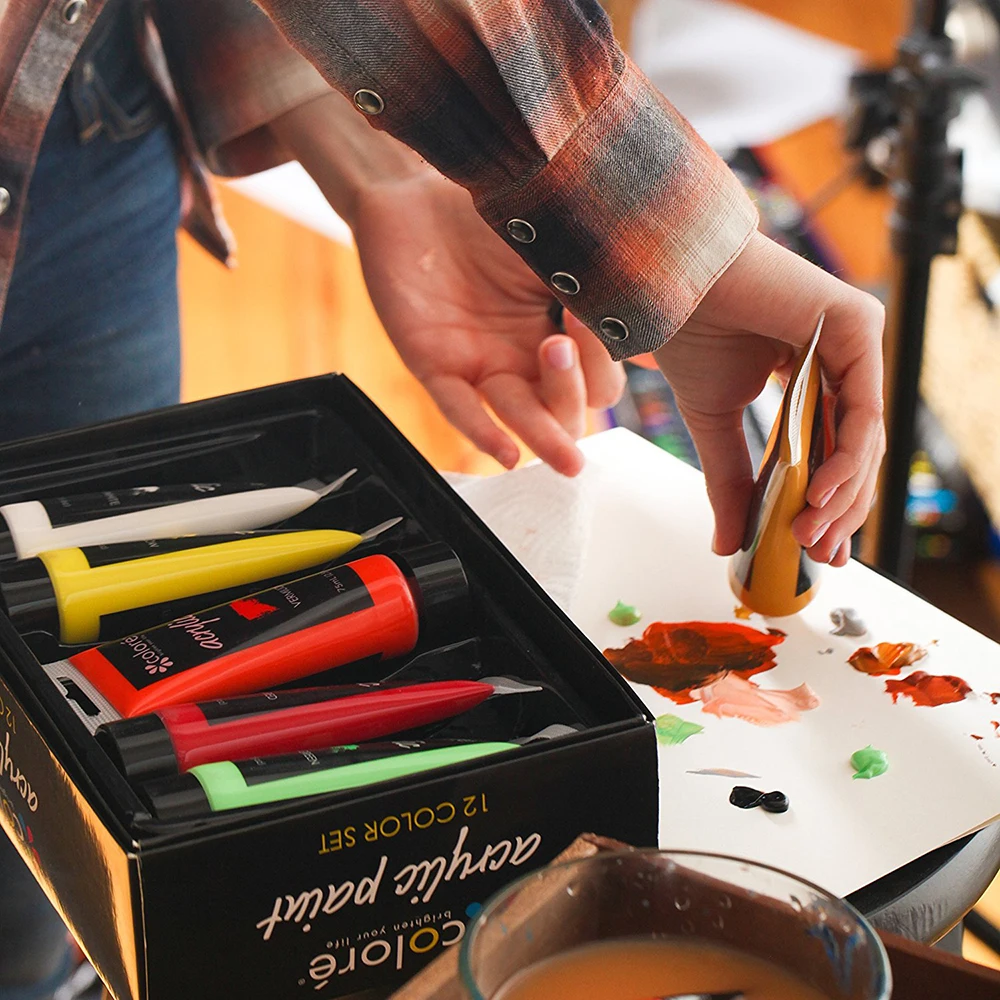 Набор акриловых красок 12 цветов. Каждая трубка наполнена 75 мл, легко сжимается и используется. Изготовлен из нетоксичного материала, безопасен и безопасен для окружающей среды. Идеальный подарок для художника, художника, студентов и всех любителей искусства.