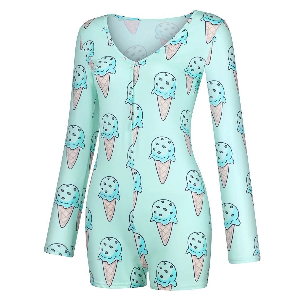 Женский модный комбинезон с v-образным вырезом и принтом мороженого, Пижамный комбинезон с длинными рукавами