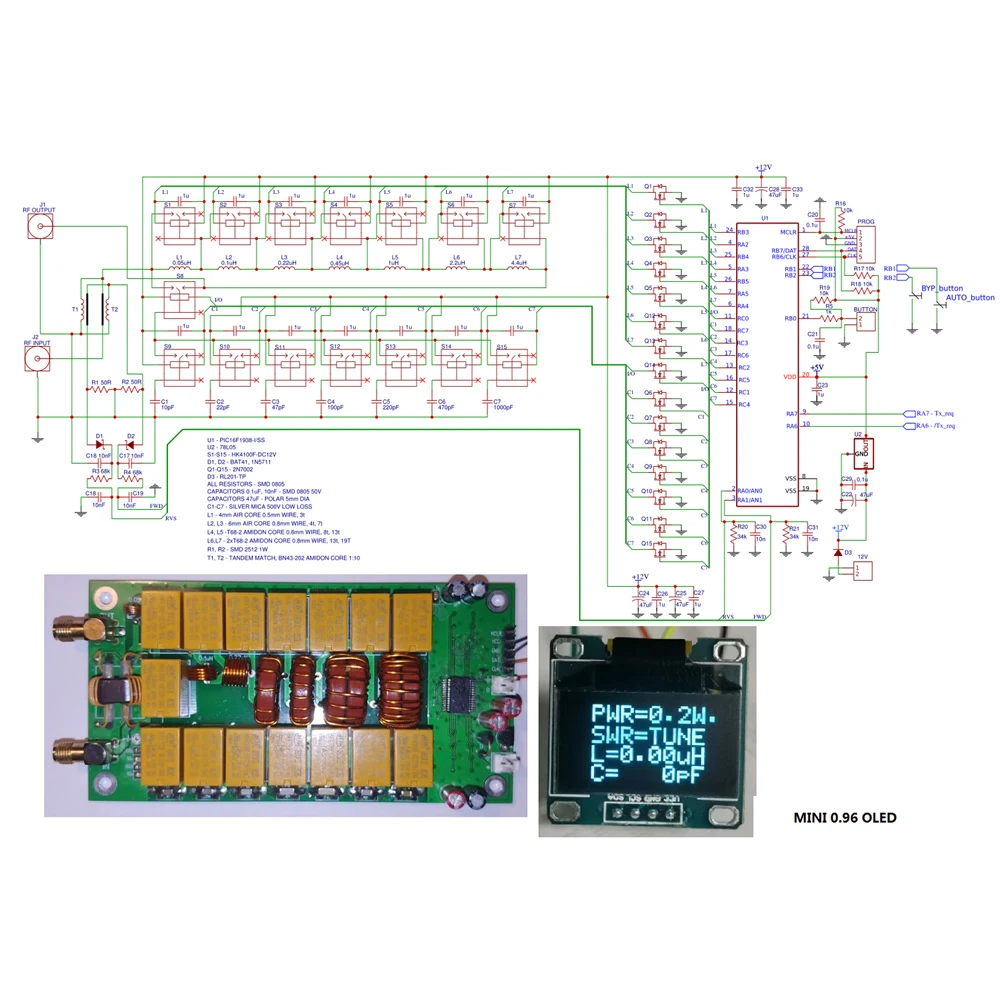 1 * набор деталей (PIC16F1938 (1 шт.) спаянный на печатной плате с прошивкой по умолчанию v3.0, 4 шт. 100R 2512 1%, 15 шт. реле HK4100F-DC12V, 1 шт. 0,96 дюйма OLED)