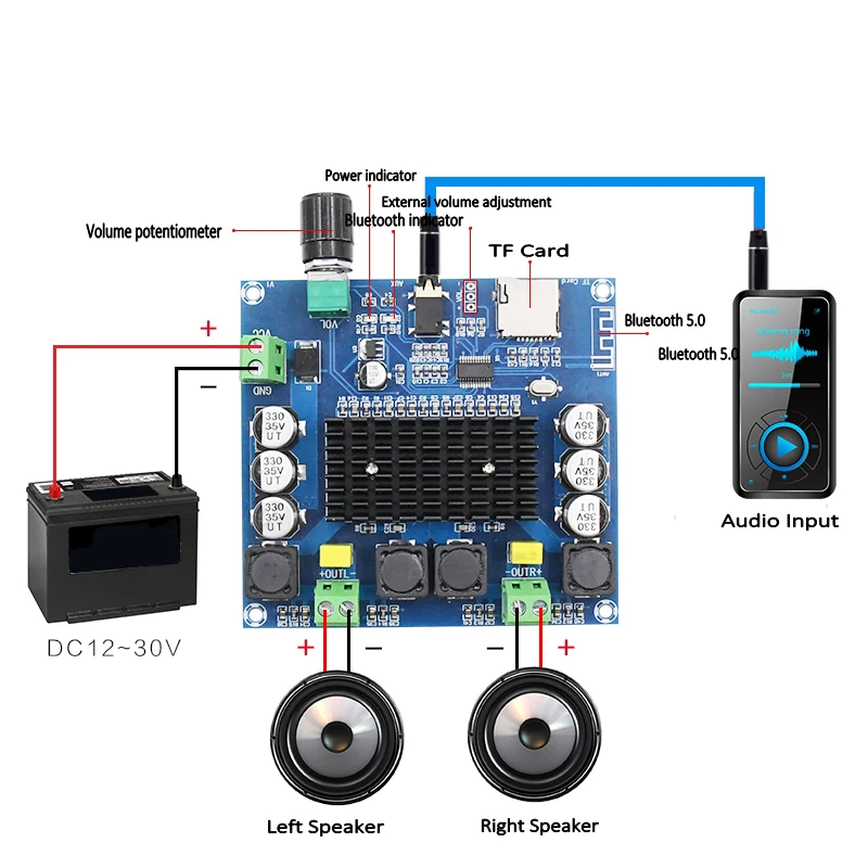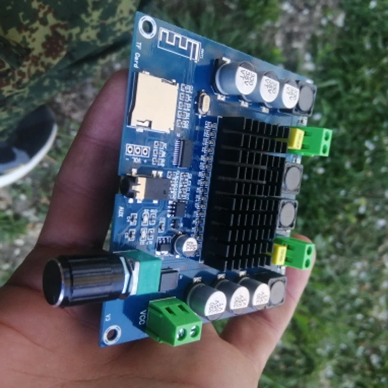 XH-A105 плата цифрового усилителя мощности с высокой точностью и двухканальным стерео качеством звука; Входное напряжение-12 ~ 24 В постоянного тока, o вход поддерживает Bluetooth, tf-карту, AUX 3,5 мм o линейный вход, может быть непосредственно подключен к мобильный телефон, MP3 и т. Д.;