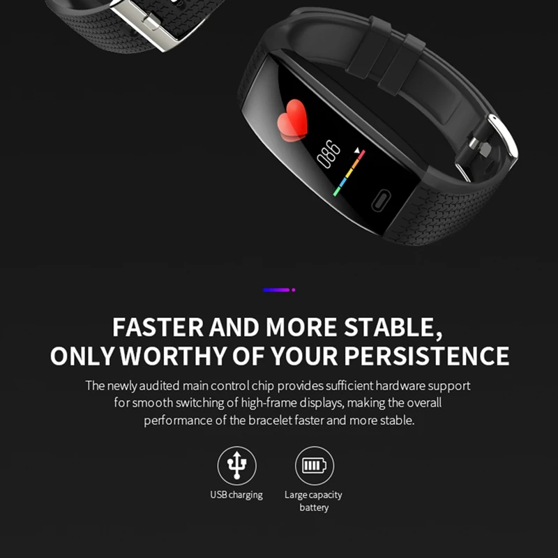 [Фитнес-трекер]: Смарт-браслет T5 имеет мониторинг температуры тела в реальном времени, монитор сердечного ритма, монитор артериального давления, Монитор кислорода в крови, термометр, Peeter, калории, расстояние, измерение качества сна, напоминание о звонках, будильник, уведомления о звонках, напоминание о сидячем положении, дистанционное управление камерой, защита от потери, Поиск телефона/браслета, напоминание о сидячем положении, Класс водонепроницаемости IP67, не беспокойтесь о стирке рук, брызге, потоотделении, дождливой погоде.