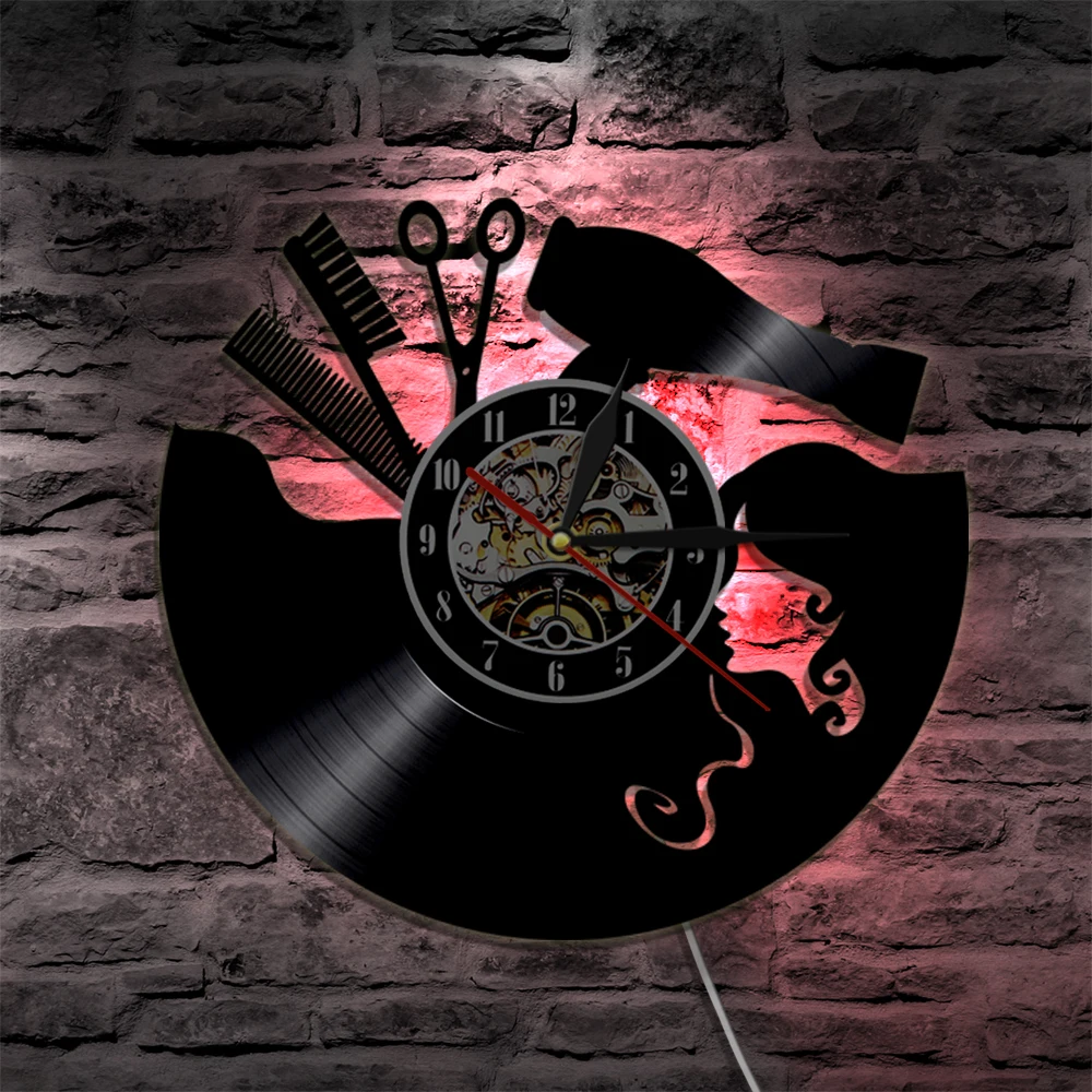 Парикмахерские виниловые часы, расческа, ножницы, фен для волос, салон красоты, настенные часы, винтажные парикмахерские настенные вывески, стрижка, искусство, подарок
