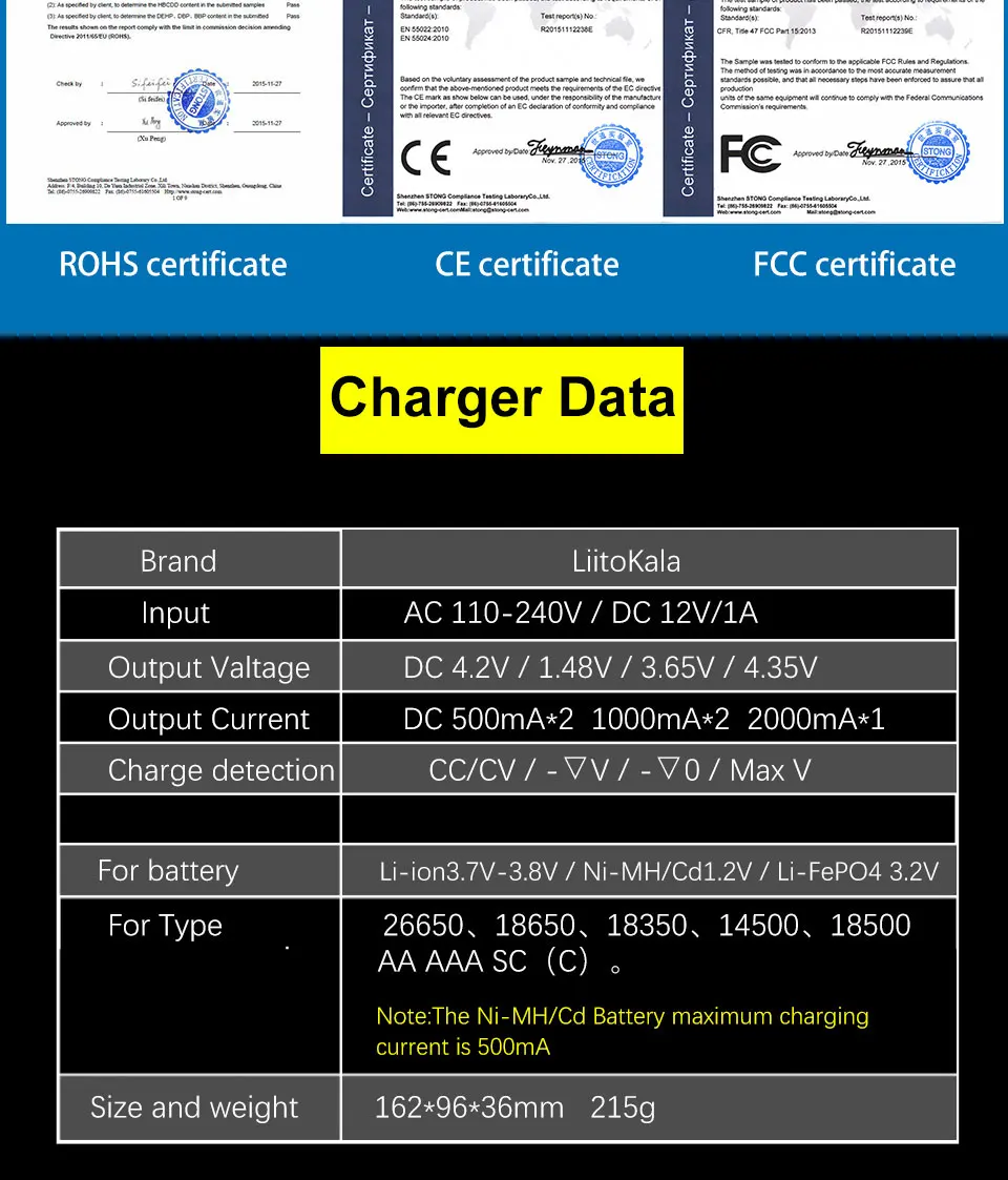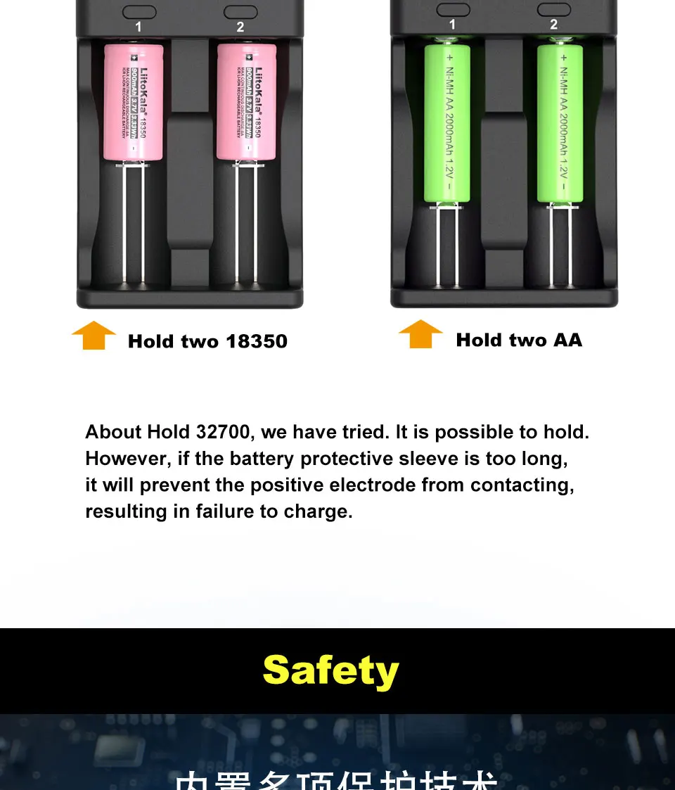 Литий-ионный 3,70 в/литий-ионный 3,85 В (IMR); Зарядный ток двух резервуаров не превышает 2 А в общей сложности, то есть, когда один из резервуаров заряжен током 2 А, И затем аккумулятор заряжается в другом резервуаре, передняя сила тока 2 а упадет заряд до тока 1 А; Когда аккумулятор полностью заряжен, будет отображаться ЖК-дисплей;