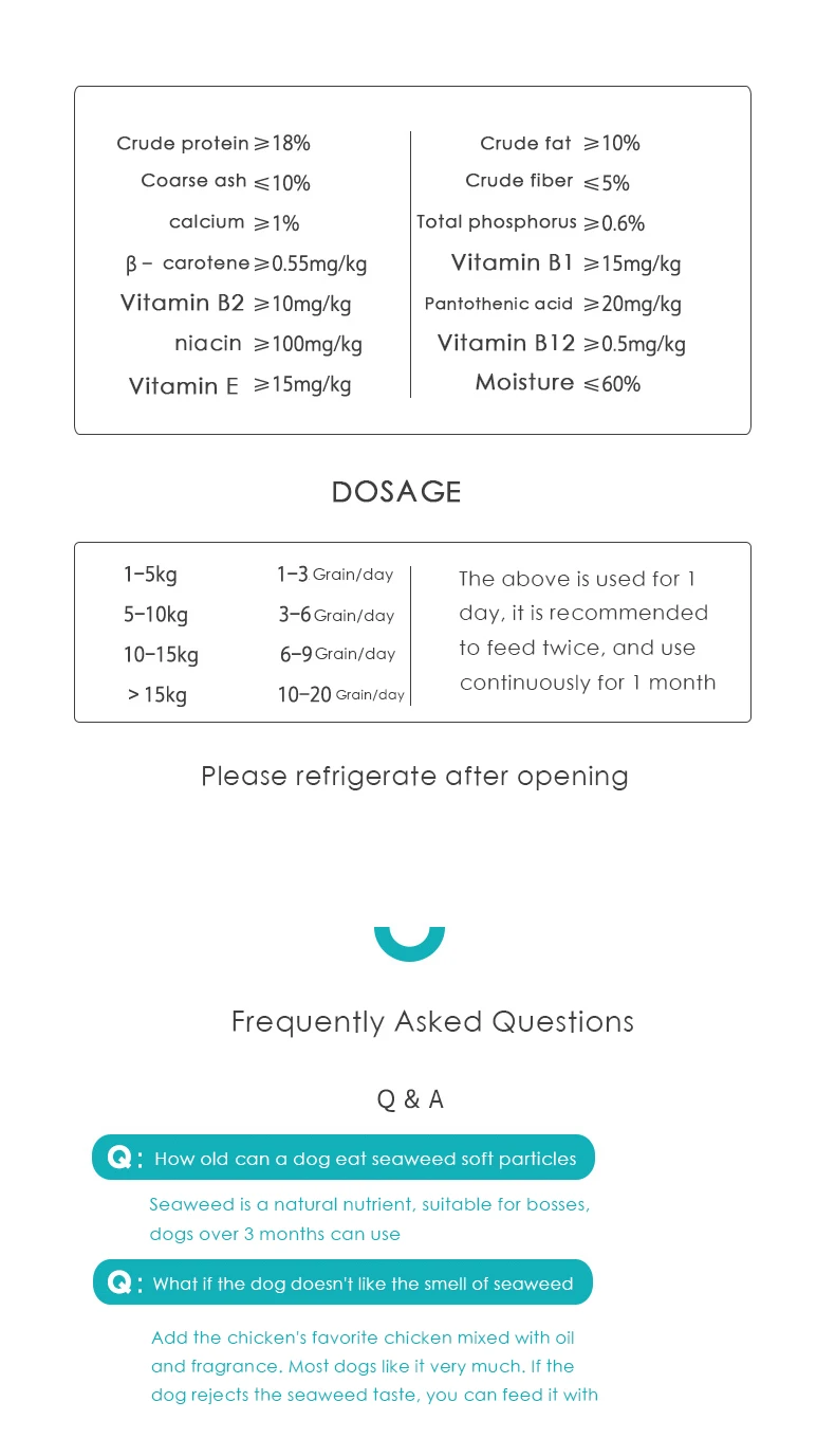 Собака формула водоросли гранулы Срок годности 18 месяцев Характеристики продукта 220 г/500 г Формула водорослей питательная добавка Омоложение домашних животных Естественное здоровье-Природные морские водоросли Он в основном выбирается из морских природных водорослей и тонко обрабатывается. Он богат разнообразными питательными веществами и биологически активными ингредиентами. Здоровая кожа-витамины Дополняют кожу питательными веществами, активируют рост эпителиальных клеток, повышают эластичность и влагу кожи, помогают контролировать перхоти и помогают росту цвета волос. Красивые волосы-содержит несколько питательных веществ Порошок яичного желтка и другие сырьевые материалы также богаты питательными веществами для питания волос Часто задаваемые вопросы Сколько лет собака может съесть морские водоросли мягкие частицы Морские водоросли являются естественным питательным веществом, подходит для боссов, собаки могут использовать более 3 месяцев Что делать, если собаке не нравится запах водорослей Добавьте любимую курицу курицы, смешанную с маслом и ароматом. Большинство собак очень нравится. Если собака отвергает вкус водорослей, вы можете накормить его йогуртом, чтобы уменьшить вкус водорослей.