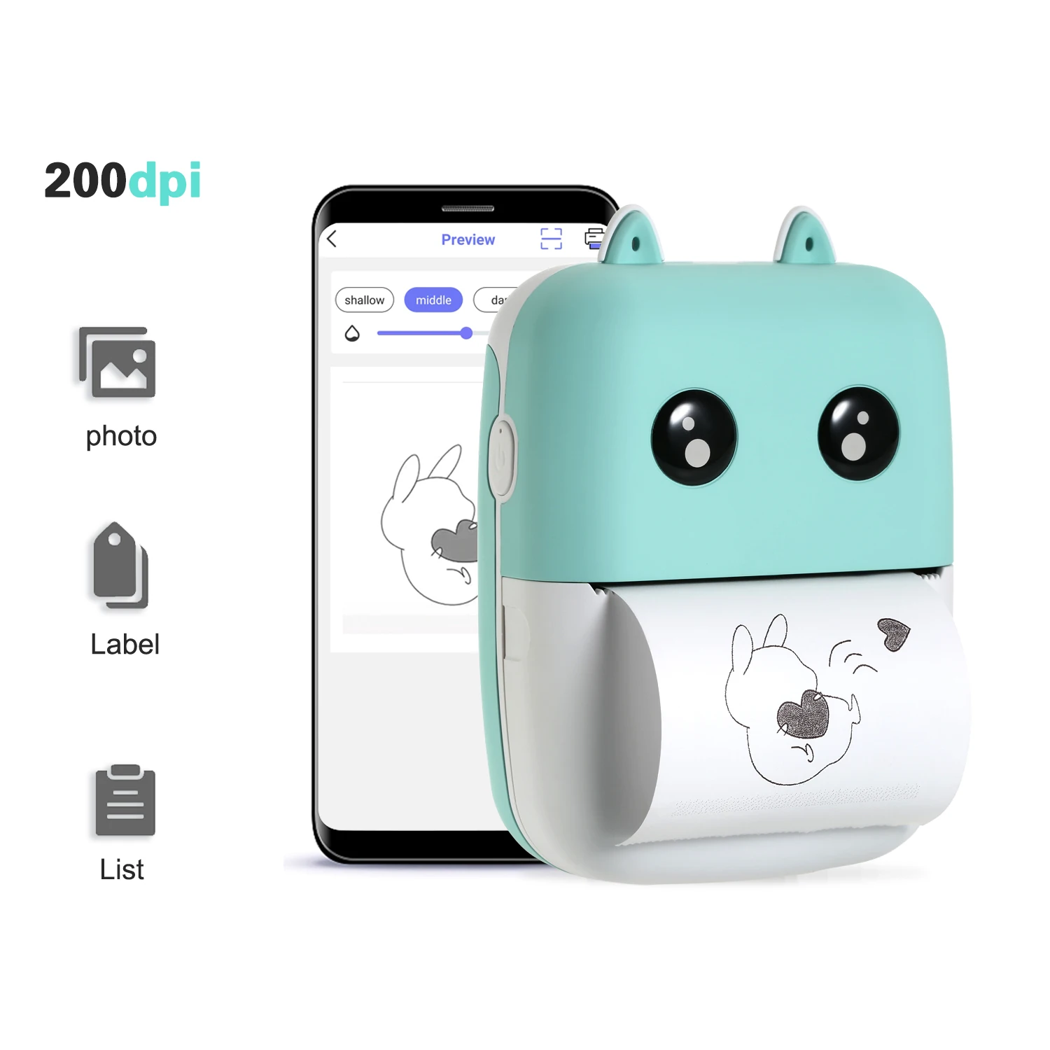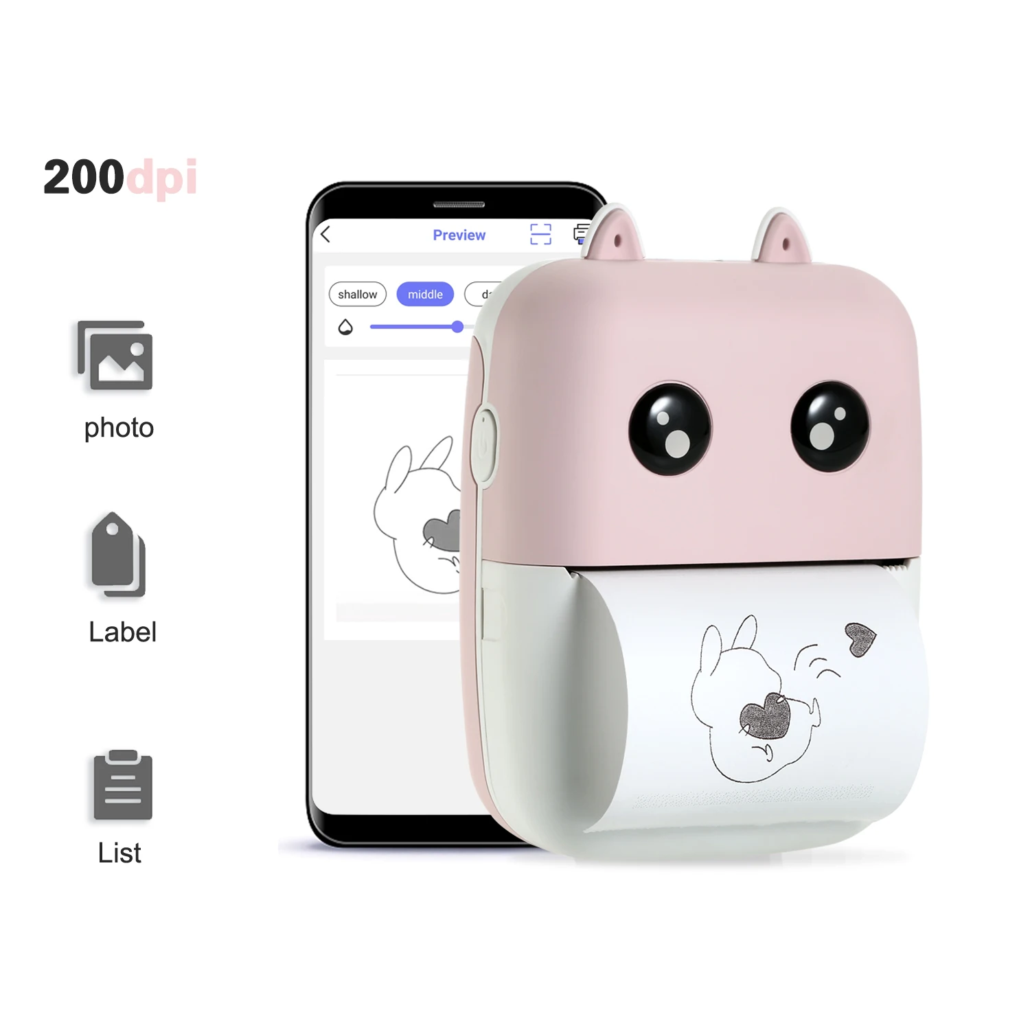 Мини термопринтер: Карманный термопринтер, подключенный BT, разрешение 200 точек/дюйм, ширина бумаги 58 мм, без проводов, печать в любое время и в любом месте.