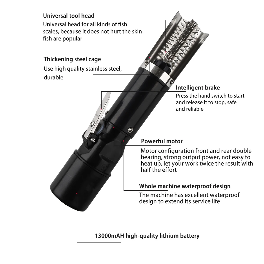 Этот скалер очень водонепроницаемый и управляется полностью медным мотором, его стальное лезвие никогда не ржавеет, не повреждая кожу рыбы в течение длительного времени, экономя время и труд, легко моется.