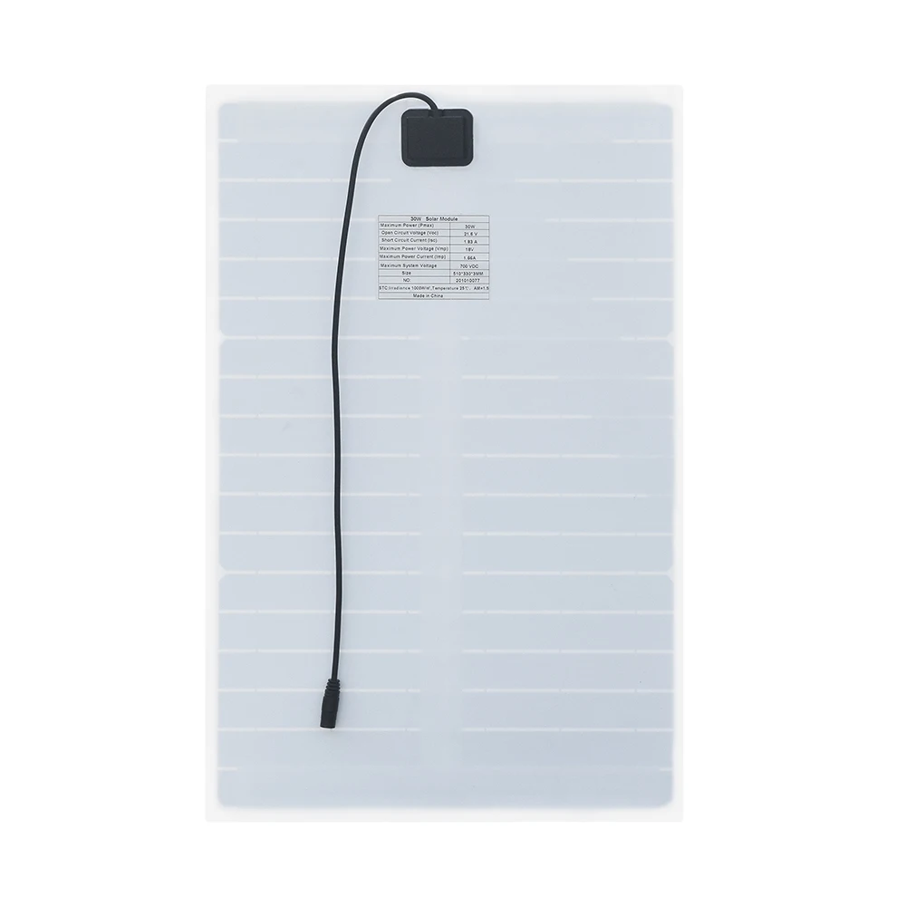 Максимальная мощность (Pmax) 30 Вт Допуск на выход + 3% Максимальное напряжение системы 700 В постоянного тока Напряжение открытого замыкания (Voc) 21,6 в Ток короткого замыкания (Isc) 1.82A Максимальное напряжение питания (Vmp) 18 в Максимальный ток мощности (Imp) 1.66A 17.5% эффективности клеток Рабочая температура (NOCT) 45 ± 2 ℃ Диапазон температур-20 ℃ ~ + 80 ℃ Количество ячеек 36 шт. Вес 0,58 кг Размер 510*330*3 мм Стандартные условия испытаний: lrradiance 1000 Вт/м2, температура 25 ℃,AM = 1,5