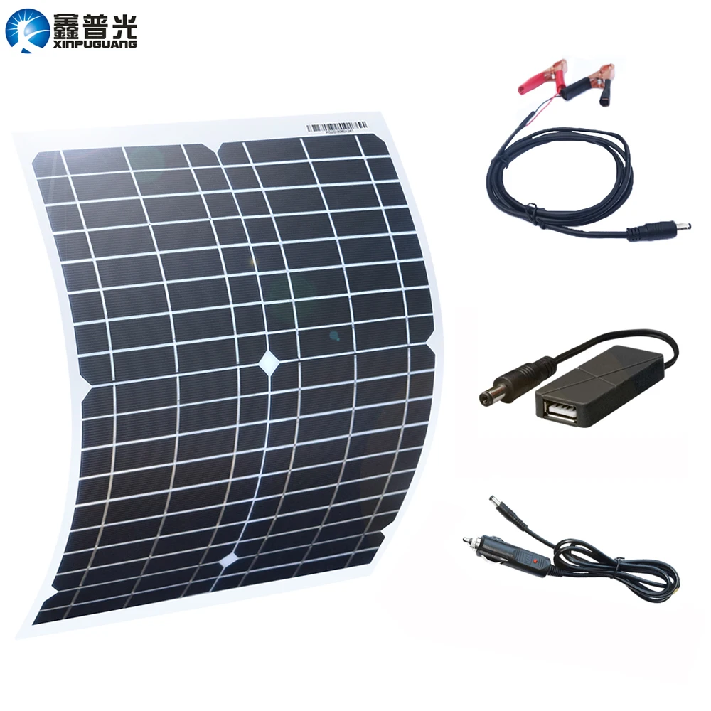1. Гибкая 30 Вт солнечная панель 2. Зажигалка 3. От постоянного тока до 5 В USB; 4. DC к зажиму аллигатора;