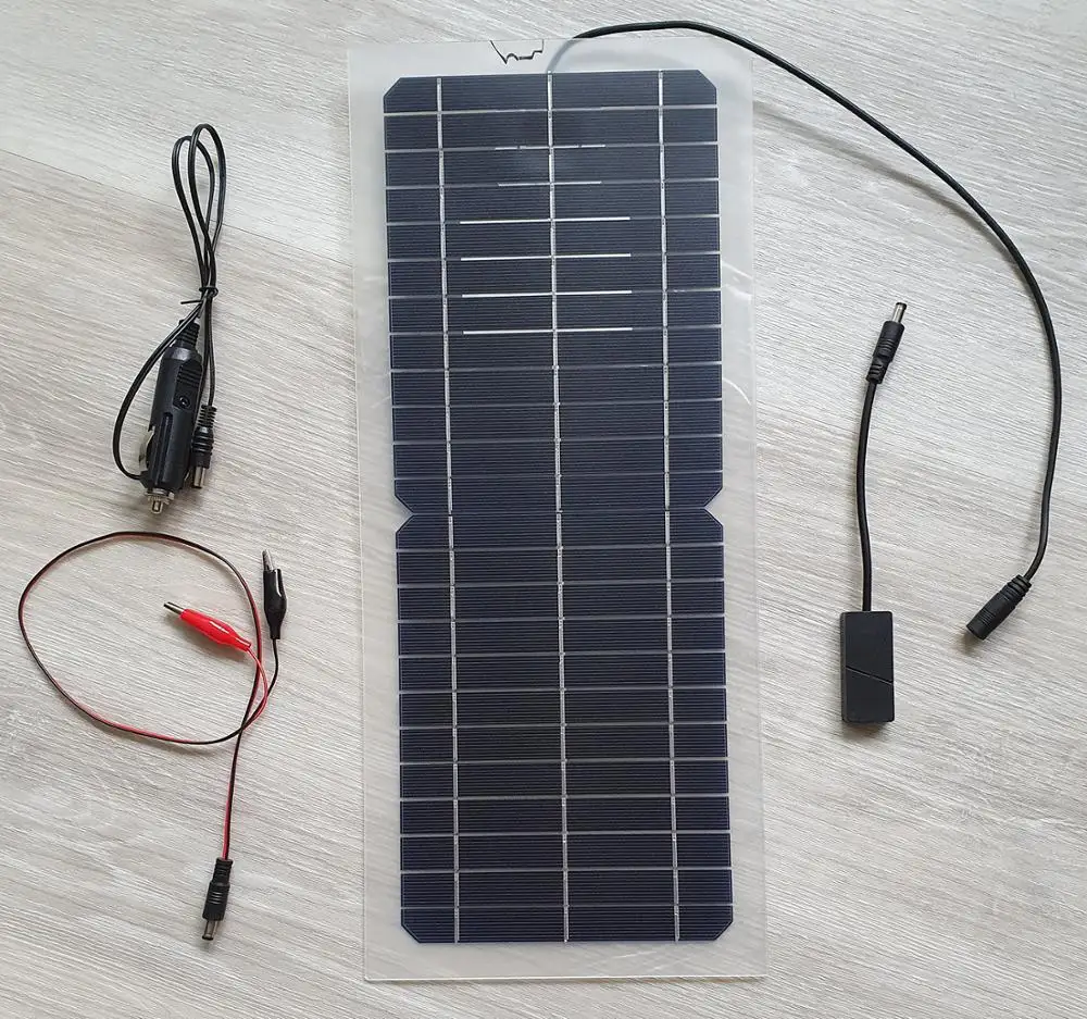 1. 1*20 Вт солнечная панель 2. 1 * DC + крокодил кабель 3. 1 * DC + кабель прикуривателя 4. 1 * USB кабель постоянного тока