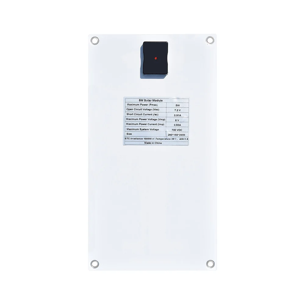 Максимальная мощность (Pmax) 5 Вт Блок регулятора напряжения USB выходного типа Допуск на выход ± 3% Номинальное выходное напряжение USB 5 В Номинальный выходной ток USB 1A 19.5% эффективности клеток Рабочая температура (NOCT) 45 ± 2 ℃ Диапазон температур-40 ℃ ~ + 80 ℃ Количество ячеек 12 шт Вес 121 г Размер 285*155*3 мм Стандартные условия испытаний: lrradiance 1000 Вт/м ^ 2, температура 25 ℃, AM = 1,5