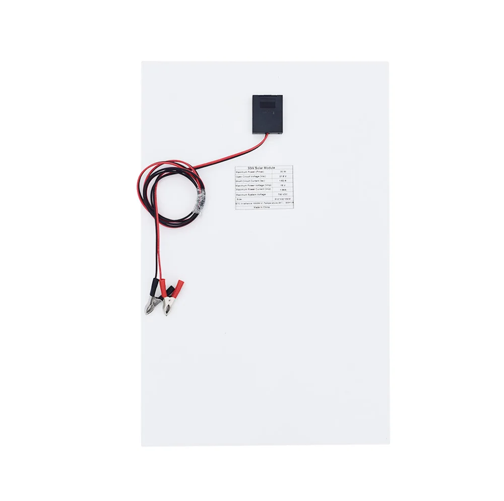 1. Материал: однокристальная батарея + ПЭТ; 2. Рабочее напряжение: 18 в Напряжение открытого замыкания: 21,6 в 3. Мощность: 30 Вт; 4. Максимальный рабочий ток: 1.66A Ток короткого замыкания: 1.82A; 5. Рабочая температура: -20 ℃ ~ + 60 ℃; 6. О размере: 510*330*3 мм; 7. Вес: 0,32 кг; 8. Распределительная коробка, выход 24AWG двухъядерный ПВХ кабель 0,5 м, с шины постоянного тока обычных мозолей; Вес 0,58 кг Размер 510*330*3 мм Стандартные условия испытаний: lrradiance 1000 Вт/м2, температура 25 ℃,AM = 1,5