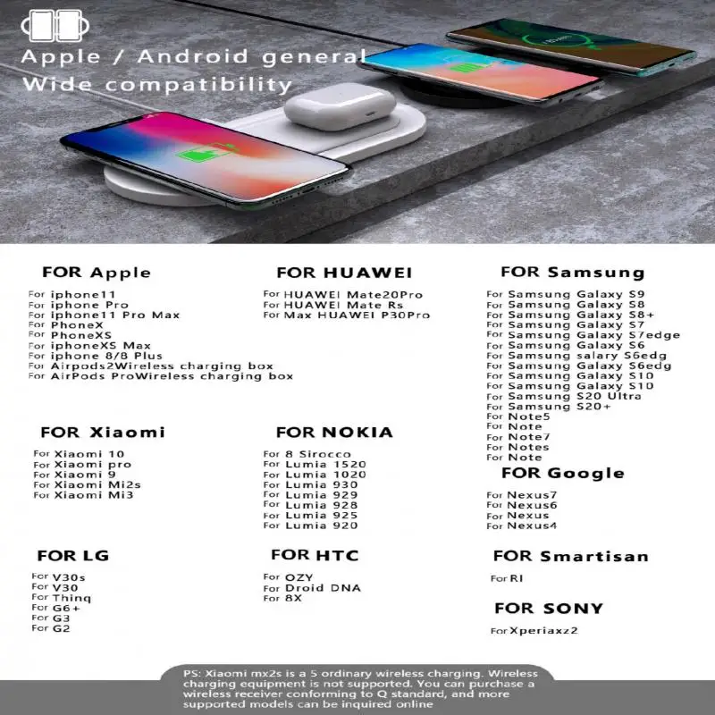 Беспроводное зарядное устройство 2-в-1: встроенное Беспроводное зарядное устройство 2Qi, вы можете заряжать 2 устройства с поддержкой Qi. Устройство Airpods оснащено беспроводной зарядной коробкой (не входит в комплект) для зарядки.