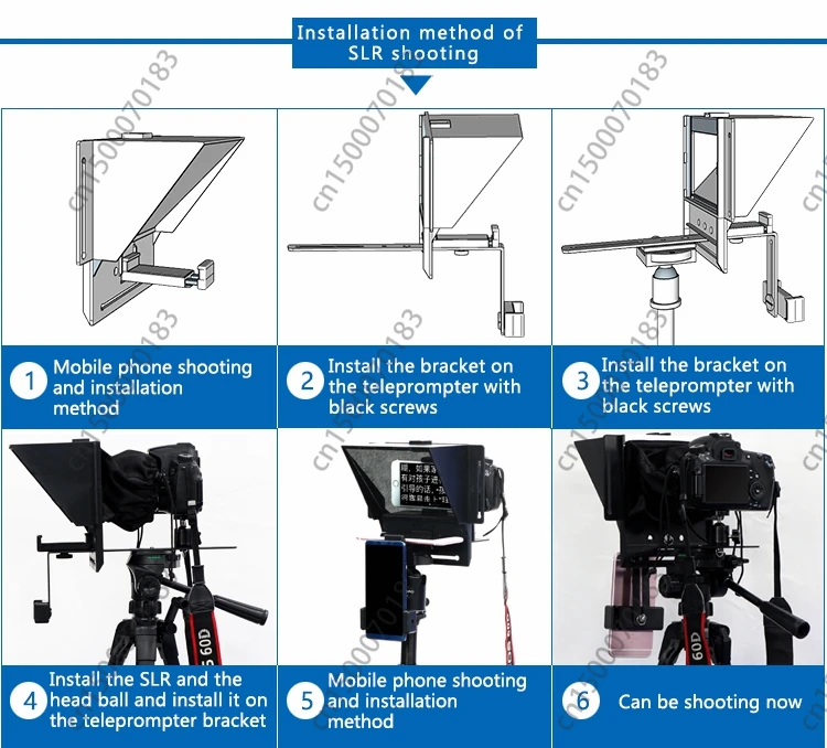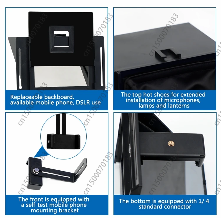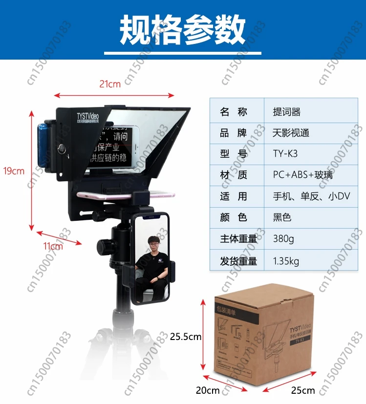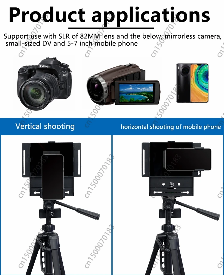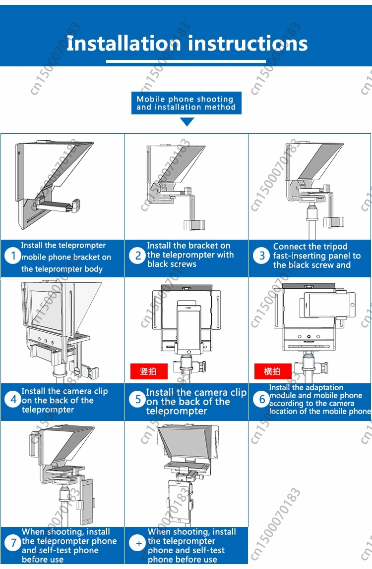 ◆ Поддержка 4-7 дюймовых телефонных звонков и съемки. ◆ Поддержка SLR, micro-single и DV с размером объектива ≤ 82 мм. ◆ Поддержка горизонтальной съемки, вертикальной съемки и фронтальной съемки мобильного телефона или с обратной стороны. ◆ Обеспечивает интерфейс горячего башмака, вы можете нажать на микрофон, съемку заполняющего света и другое вспомогательное расширительное оборудование. ◆ Предоставляем программное обеспечение teleprompter для поддержки пользователей IOS и Android. ◆ Представляем пульт дистанционного управления Bluetooth, который может ускорить и замедлить трансляцию текста, приостановить воспроизведение и настроить работу.