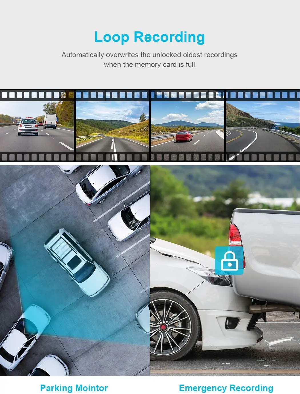 Циклическая запись позволяет непрерывно записывать, даже если карта памяти SD достигает полной емкости; Сенсор G обнаруживает внезапное столкновение и блокирует изображения столкновения; монитор парковки работает в качестве системы камеры наблюдения во время выключения транспортного средства; Помощник по парковке автоматически переключается на обратное изображение при реверсе.