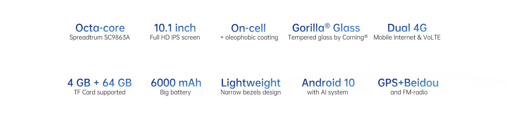 Model No. UNIWA iPlay 20 Dimensions 241.3*171.7*8.7mm Net Weight 450g (Including battery) Style Call tablet Service Provide Unlocked SIM Card Dual Nano SIM card dual standby (or 1 nano SIM+ 1 micro SD) OS Android 10.0 CPU SC9863A octa core A55@1.6GHz; GPU:PowerVR GE8322@550MHz Screen 10.1 inch 10 points Corning Gorilla III IPS touch screen, 1920*1200px, 320dpi RAM 4GB RAM ROM 64GB ROM, support TF card up to 256GB maximally