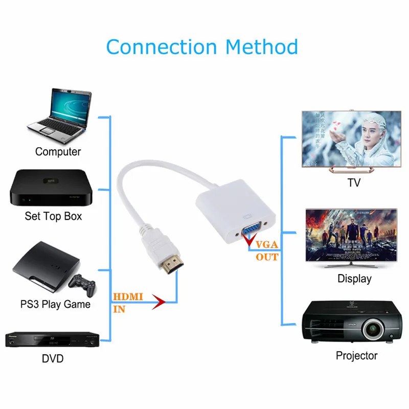 Особенности: Поддерживает разрешение до 1080P (1080p Full HD), включая 480P/ 576P / 720P для HD мониторов или проекторов Подходит для всех устройств с интерфейсом HDMI и VGA Встроенный чип преобразования улучшает Совместимость Конструкция Plug and Play, без специальной настройки Характеристики: Название товара: адаптер HDMI-VGA Версия: нет звука без питания Вход: HDMI папа тип A 19pin Выход: VGA Женский Длина кабеля: около 160 мм Цвет: черный/белый Максимальное разрешение: 1080P Материал: Поликарбонат Размер: l45мм * w45мм * h15мм Упаковочный лист: 1 * HDMI в VGA конвертер