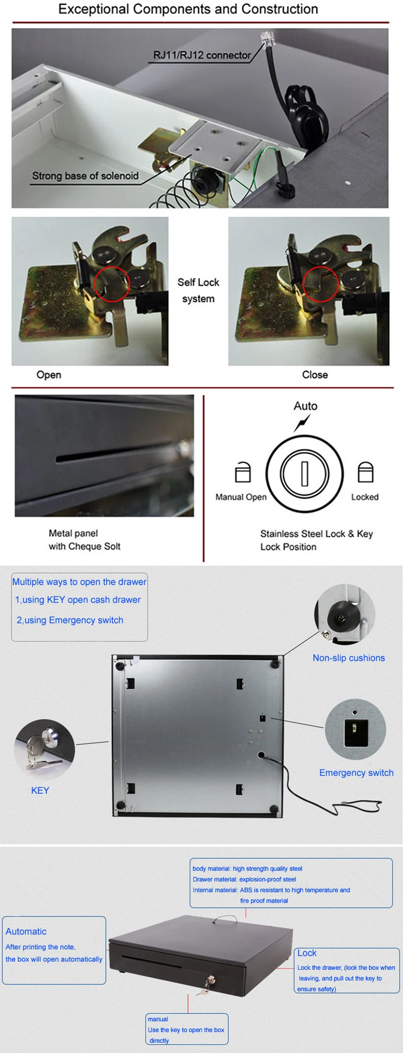 Модель: HBA-400C Интерфейс: RJ11 Отделение для купюр: 5 купюр Блок Билл Размеры: 17,5 (Д) * 7,8 (Ш) * 5,8 (H) Отделение для монет: 5 монет Фиксатор положения: 3 фиксатора положения Проверьте слот: 2 слота Для чеков Ширина: 11,2 см Размеры (Ш * Д * В): 405 мм (Ш) * 420 мм (Д) * 90 мм (В) Высота стопы: 1,1 см Чистая Вес: 5,6 кг Брутто Вес: 6,0 кг Цвет: черный/белый Посылка: 470*462*150 мм