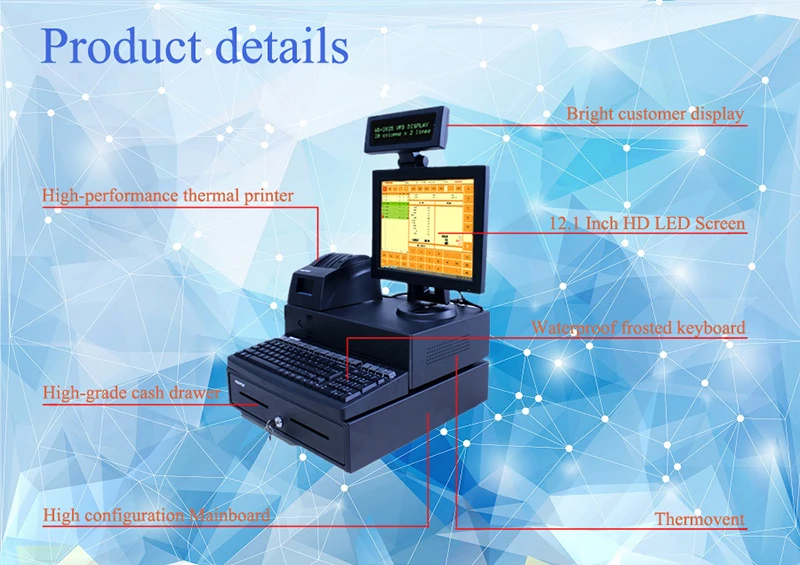 Модель: HBA-R5 Процессор: Intel®Celeron®J1800 (скорость 2,41 ГГц), двухъядерный Оперативная память: 2 Гб DDR3 1600/1333 МГц, 1x SO-DIMM Оператора Дисплей: 13,3 "светодиодный Экран (1280*800) Дисплей клиента: 2 линии x 20 символов VFD SSD/HDD: 32 ГБ/160 Гб Интерфейсы: PCI-E LAN для Ethernet 1000 Мбит/с 1 х COM 1 x параллельный порт LPT 1 x PS/2 для клавиатуры 1x15 pin VGA Женский Тип 6 x USB 2,0 Денежный ящик: один чек, семь банкнот Клавиатура: KB-101 Пыленепроницаемая клавиатура Принтер: 58 мм Термопринтер Аудио: линейный/Mic-in, 2 x Стереодинамики с регулятором громкости Входная мощность: 120-240 В