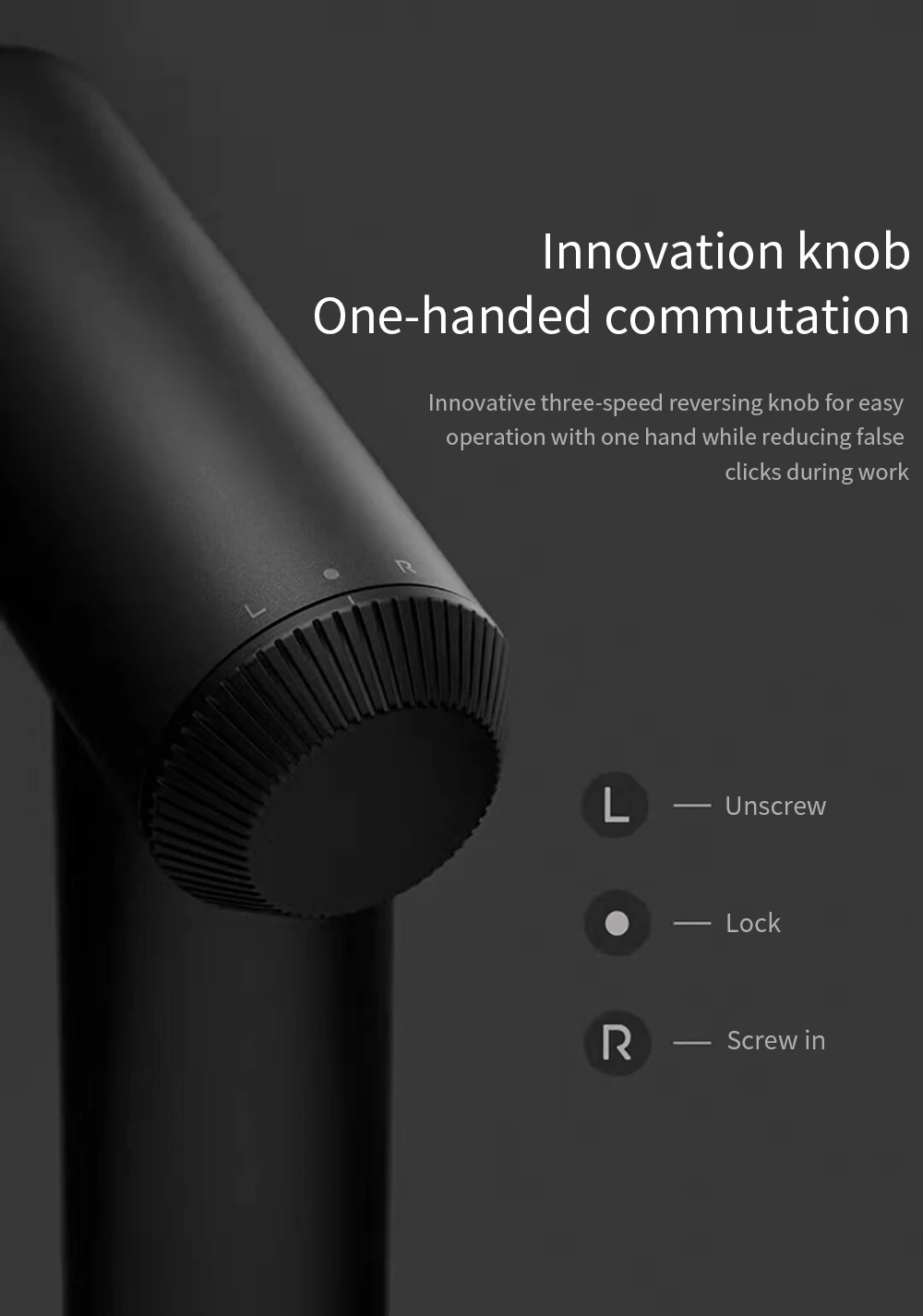 Инновационная трехступенчатая ручка заднего хода, наберите на левую шестерню L, чтобы выкрутить, правая Шестерня R Завинчивается, и среднее нейтральное кольцо для блокировки. Легко Работать одной рукой, уменьшая возможность случайного касания во время работы.