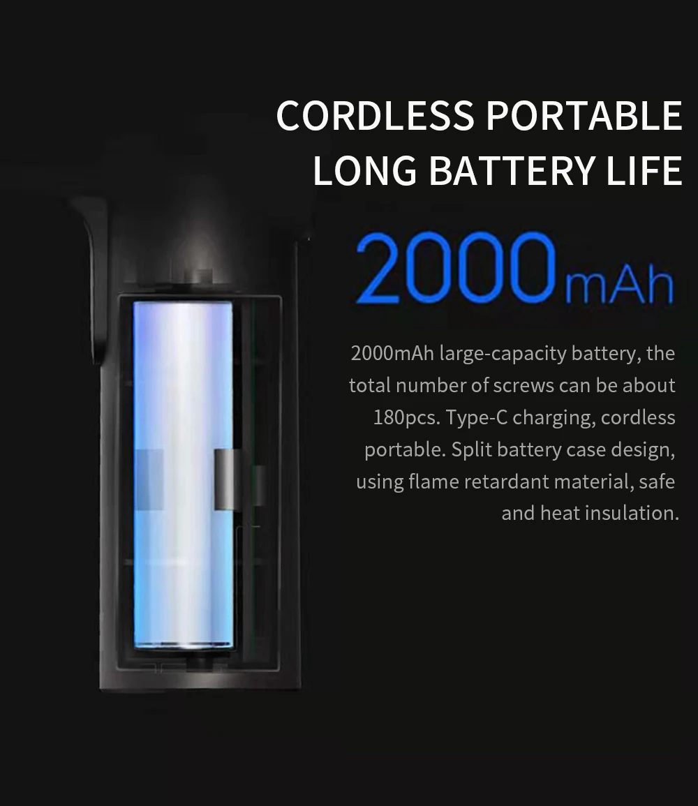 2000mAh2 аккумулятор большой емкости, общее количество винтов может быть около 180pcsl3l. Зарядка типа C, Беспроводная портативная. Сплит-чехол для батареи с использованием огнезащитного материала, безопасного и теплоизоляции.