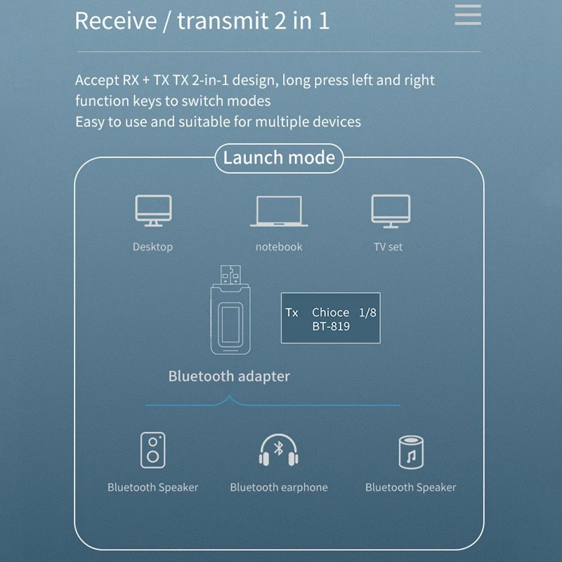 2 в 1 bluetooth-передатчик и приемник, как передатчик Bluetooth o, он специально разработан для устройств o (например, MP3, MP4, TV и PC и т. д.) без функции Bluetooth. Вы можете подключить bluetooth-передатчик к устройствам o без функции Bluetooth через прилагаемый разъем 3,5 мм o, заменив эти устройства o на устройства с поддержкой Bluetooth o, И делает его работать с bluetooth-гарнитурой и динамиком; Как приемник Bluetooth o, он специально разработан для автомобильной стереосистемы s и домашней системы o. Он может изменить традиционные автомобильные стерео системы и домашние o системы на Bluetooth и легко сопрягать с Bluetooth-совместимыми смартфонами, ноутбуками, планшетами и т. Д. С помощью этого продукта вы можете наслаждаться музыкой с вашего телефона, ноутбука, планшета без хлопот кабелей.